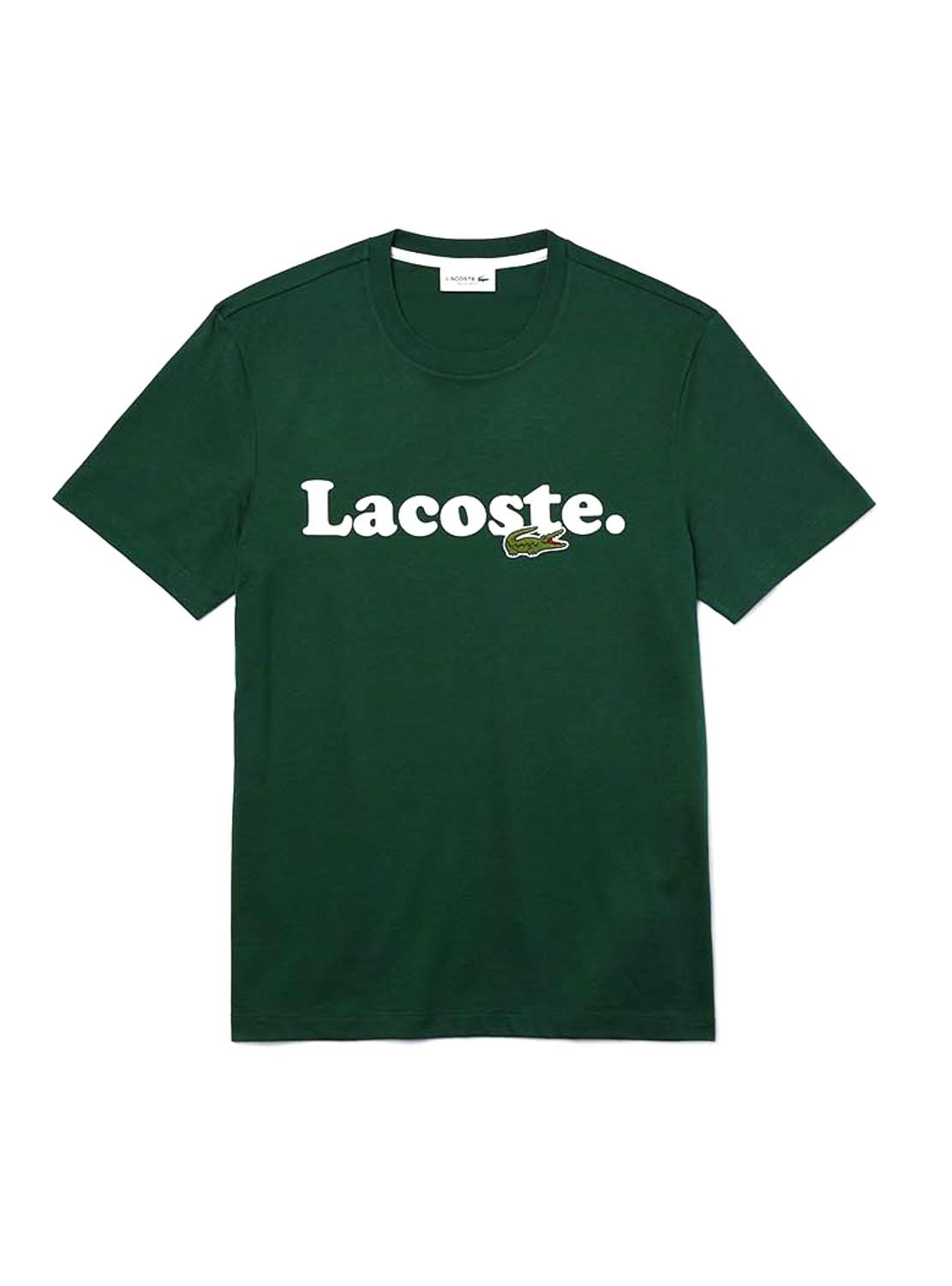 T-Shirt Lacoste. Modelo itálico. Cor verde. Pescoço redondo. Manga curta. Marca estampada no peito com crocodilo bordado. Regular fit