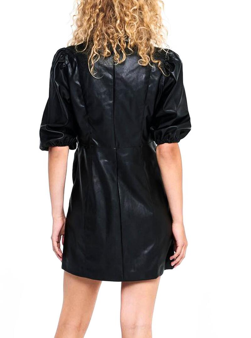 Vestido Only. Modelo Rila. Cor preta. Fechamento de botão automático. Mangas curtas bufantes com bainha elástica. Colarinho da camisa. Corte na cintura. Mini comprimento. Tecido de couro sintético.