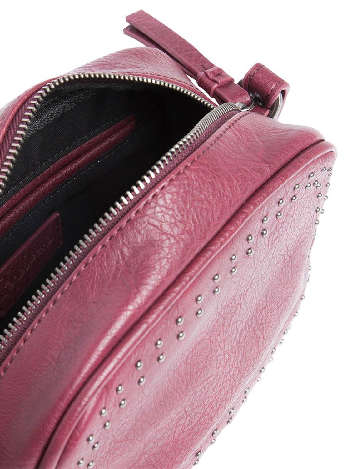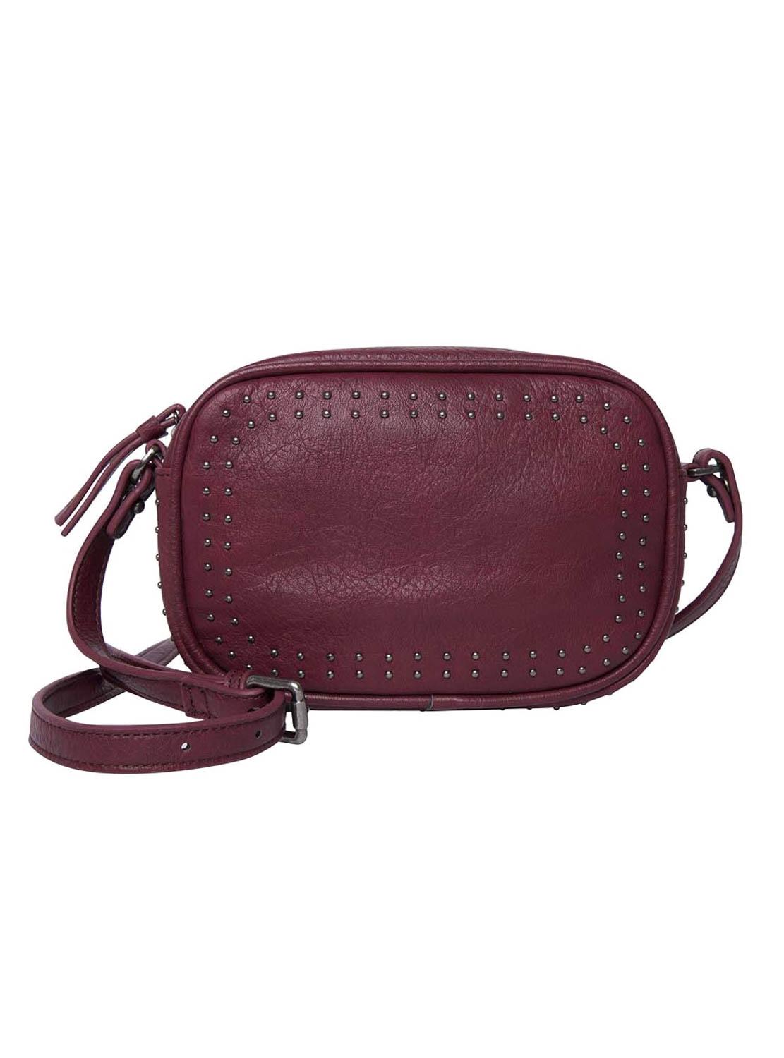 Bolsa Pepe Jeans. Model Angela. Cor granada. Fecho com zíper. Alça ajustável. Pregos de prata. Bolso interno. Logotipo metálico.