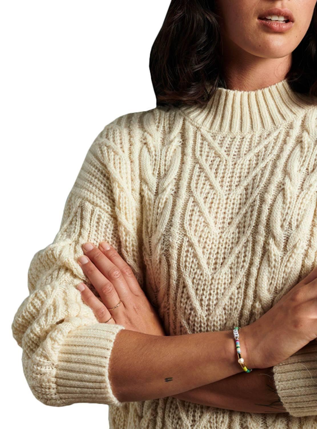Vestido Superdry. Modelo de Florença. Cor bege. Pescoço longo. Manga comprida. Extremidades com nervuras. Ombro caiu. Corpo com tecido trançado. Acima do joelho. Bainha com etiqueta da marca. Regular fit