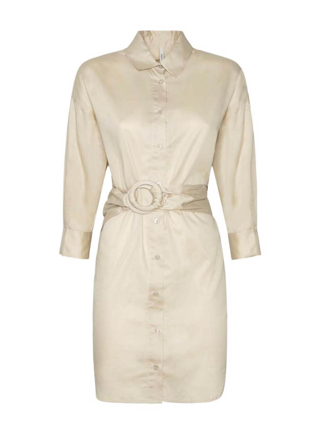 Vestido Pepe Jeans. Modelo Tatiana. Cor bege. Estilo de camisa. Fechamento de botão. Tecido de cetim. Manga comprida. Cinto incorporado em sintonia com o vestido. Corte acima do joelho.