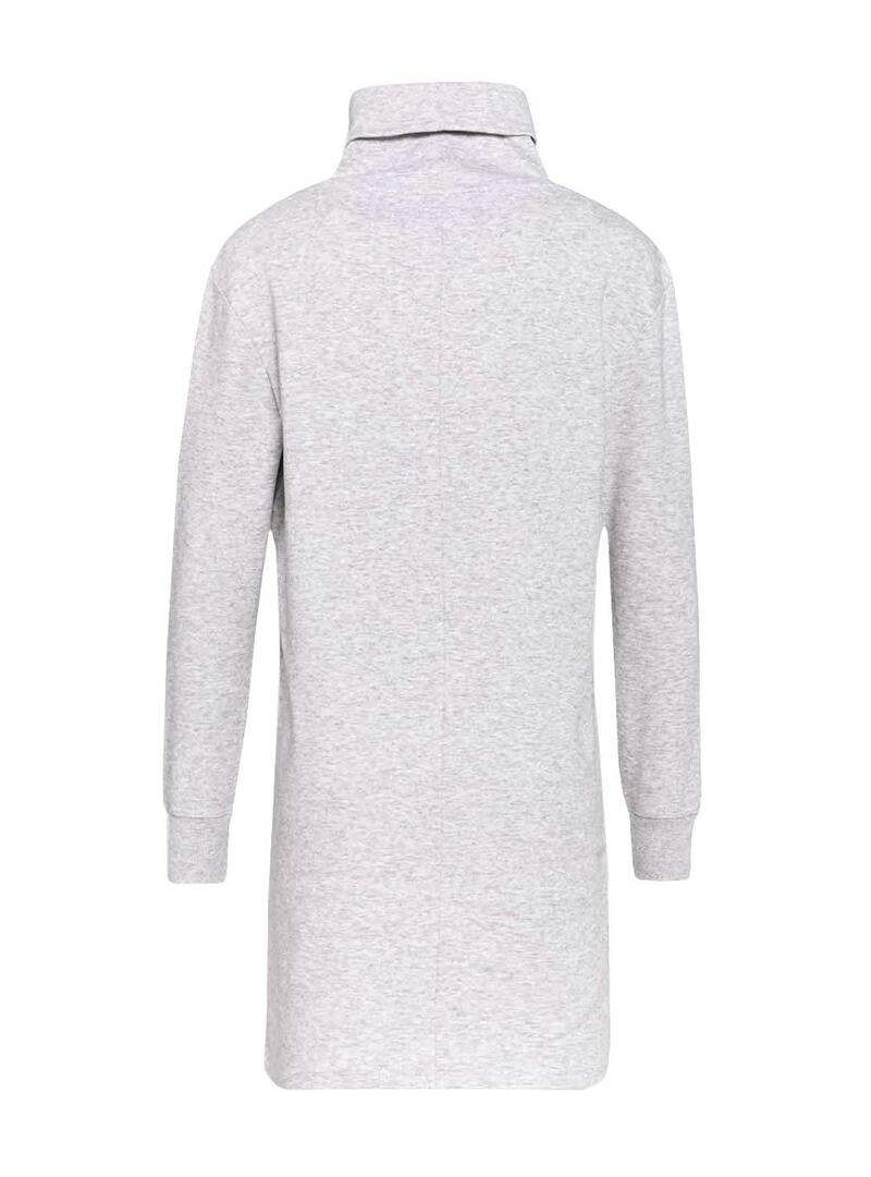 Vestido Calça jeans Tommy. Modelo simulado. Cor cinzenta. Gola alta com dobra. Manga comprida. Emplastro de marca bordado no peito. Extremidades da manga com nervuras.