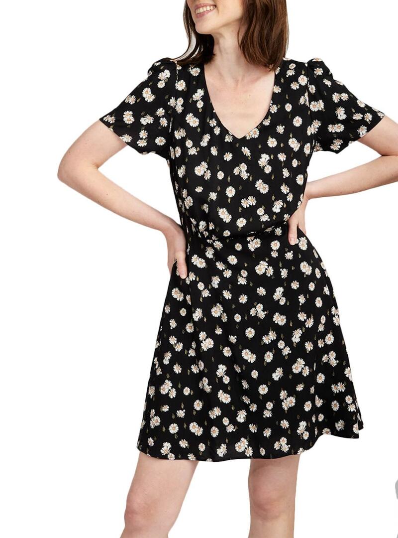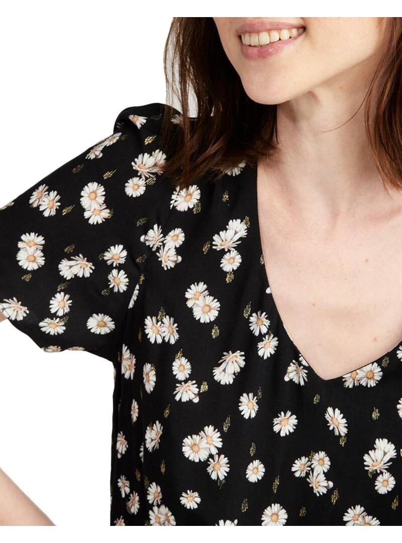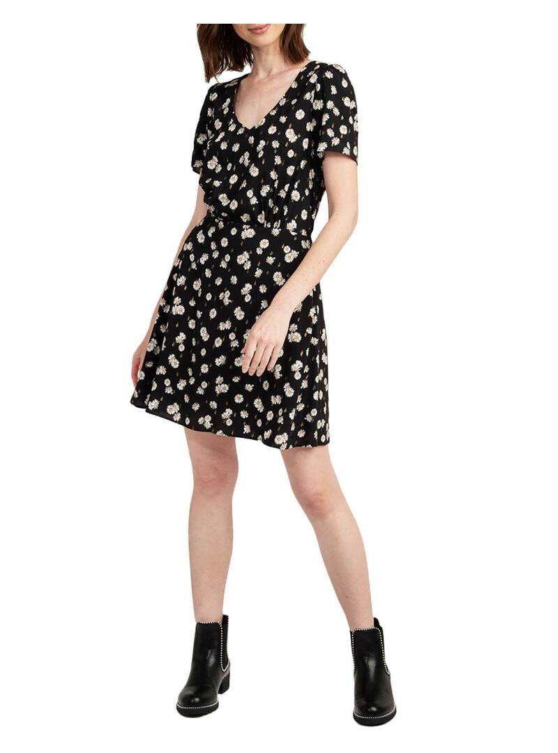 Vestido Naf Naf. Formato curto. Cor preta. Borracha na cintura. Manga curta. Gola V. Estampa margarida e detalhes dourados. A modelo usa um tamanho 36.