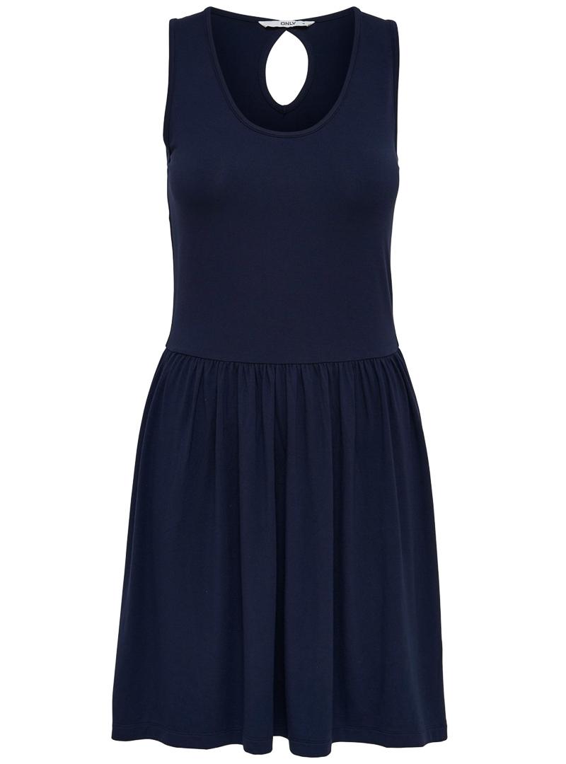 Vestido Only. Modelo Rina. Pescoço redondo. Cor azul. Sem mangas. Abertura nas costas. Corte na cintura. Saia com vôo.