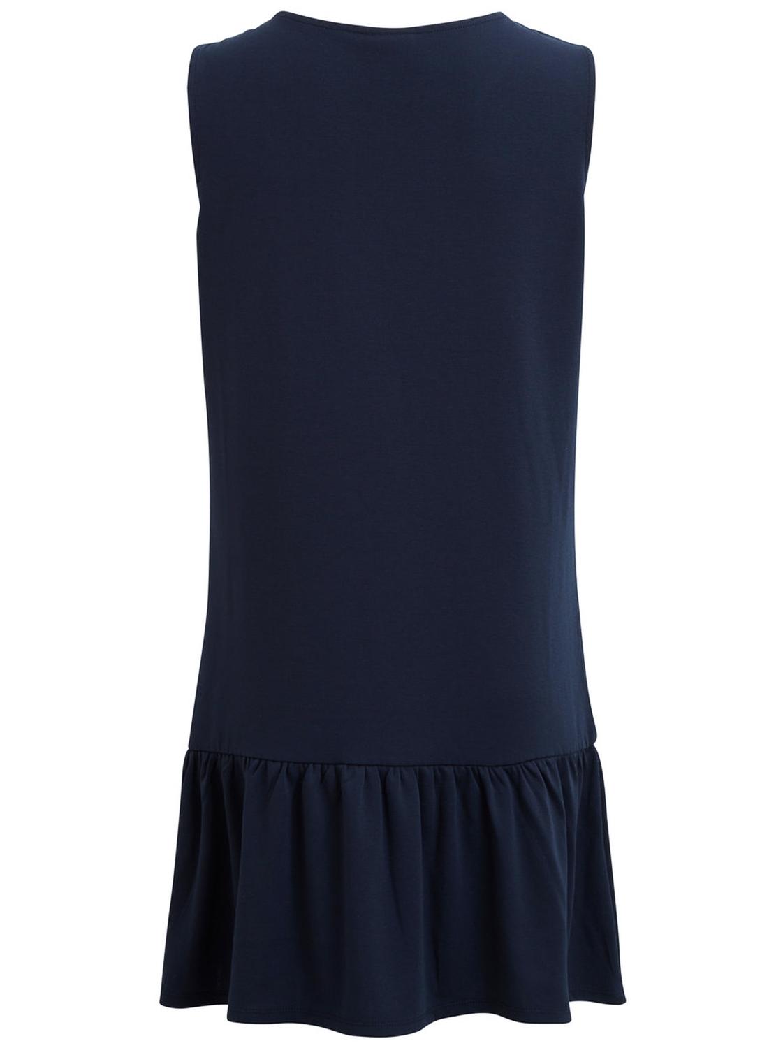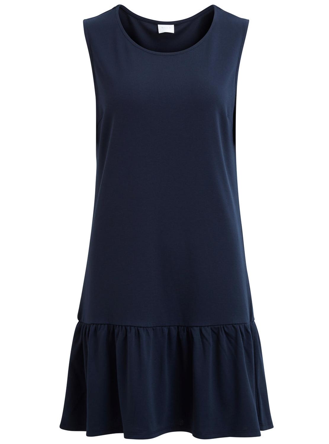 Vestido Vila. Modelo Vitinn. Cor azul. Sem mangas. Pescoço redondo. Babado no baixo. Regular fit. A modelo usa tamanho S.