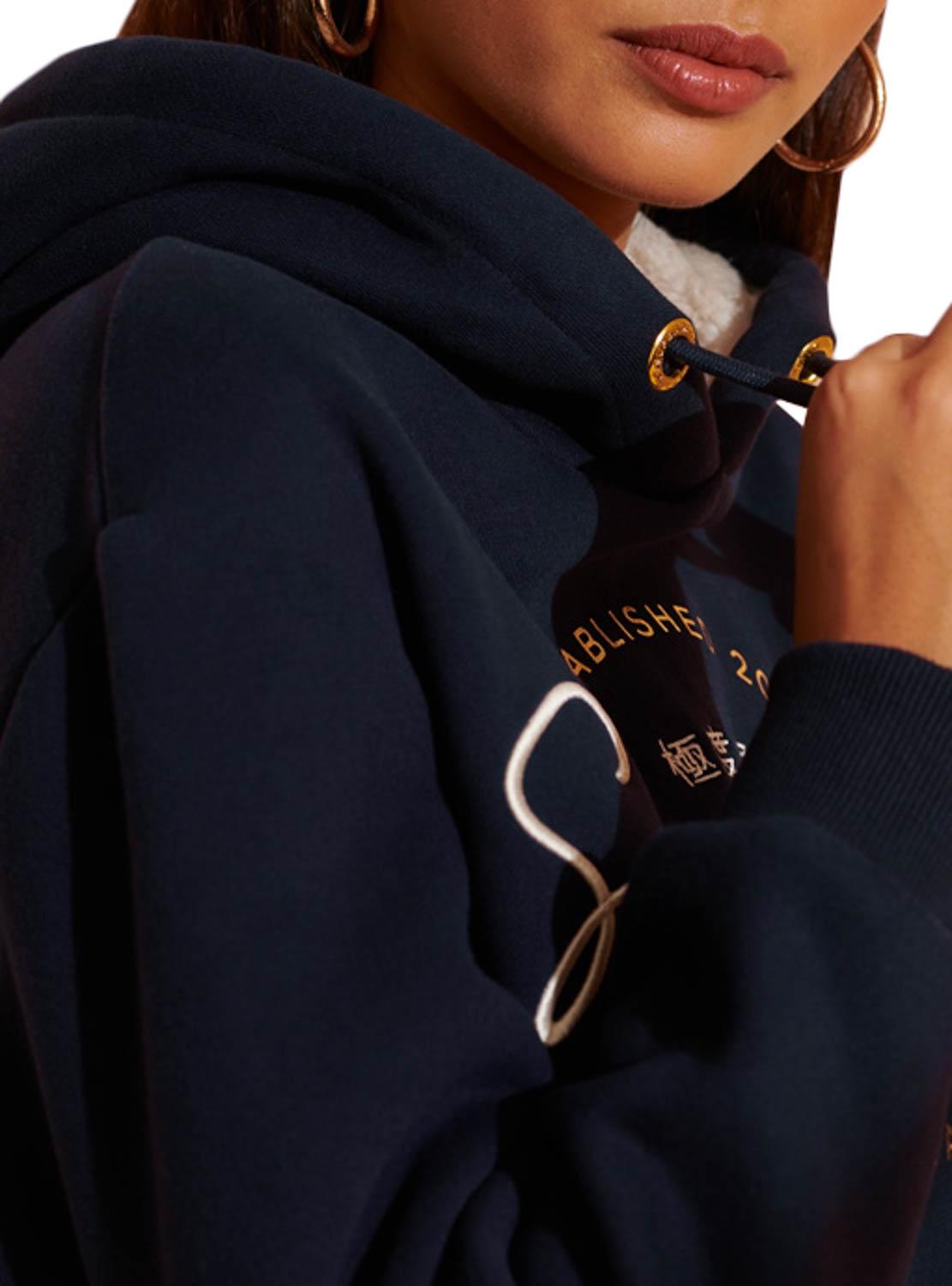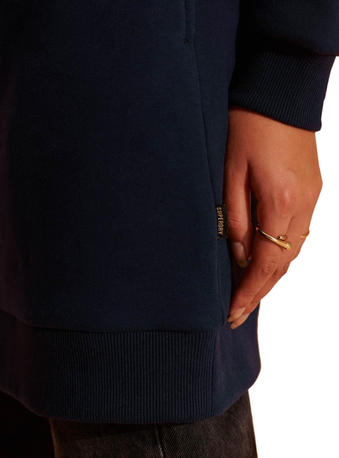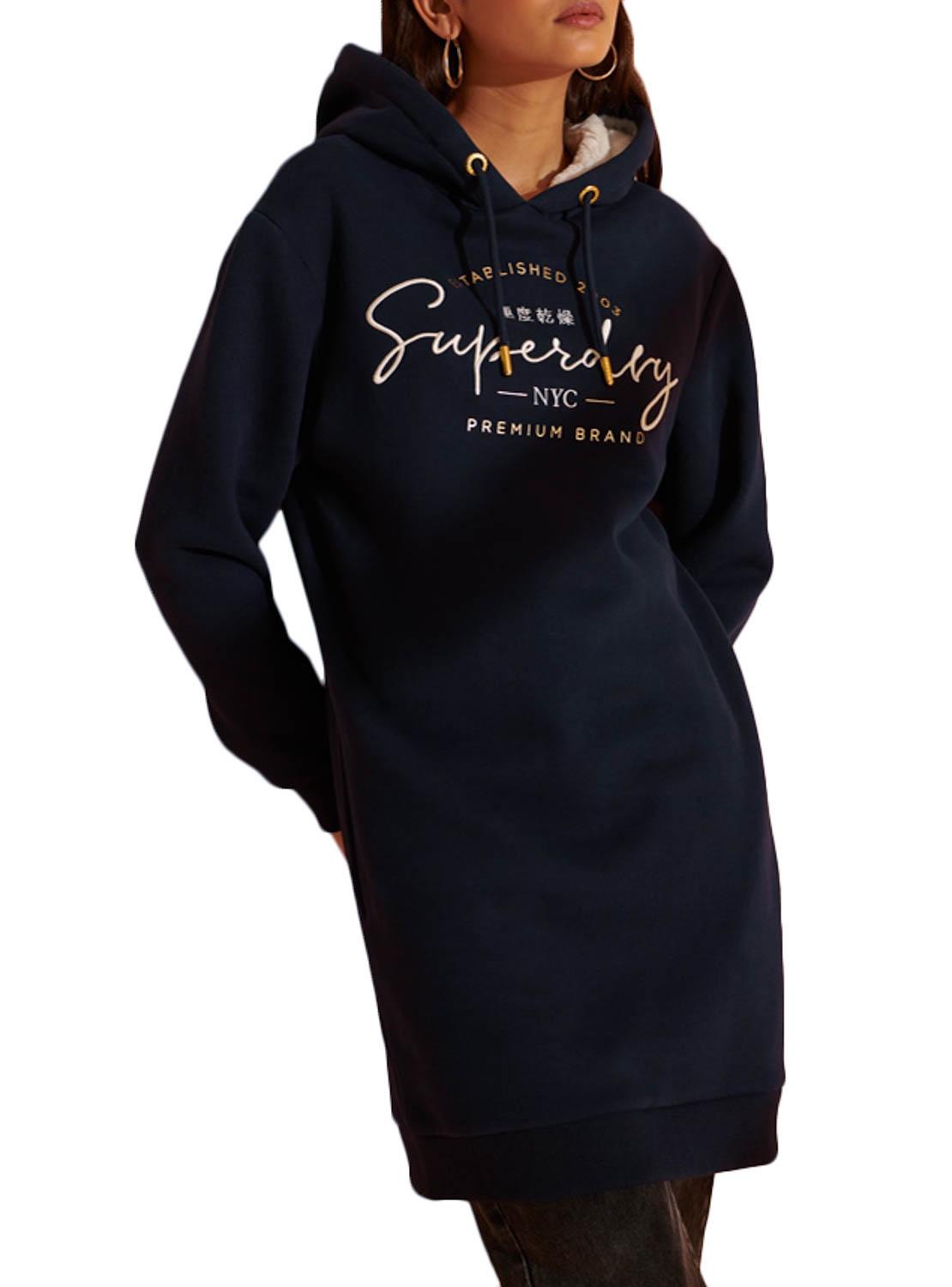 Vestido Superdry. Modelo Established . Cor da Marinha. Capuz com cabo ajustável. Extremidades com nervuras. Estilo de moletom. Bolsos laterais. Logótipo bordado no peito. Detalhes em ouro.