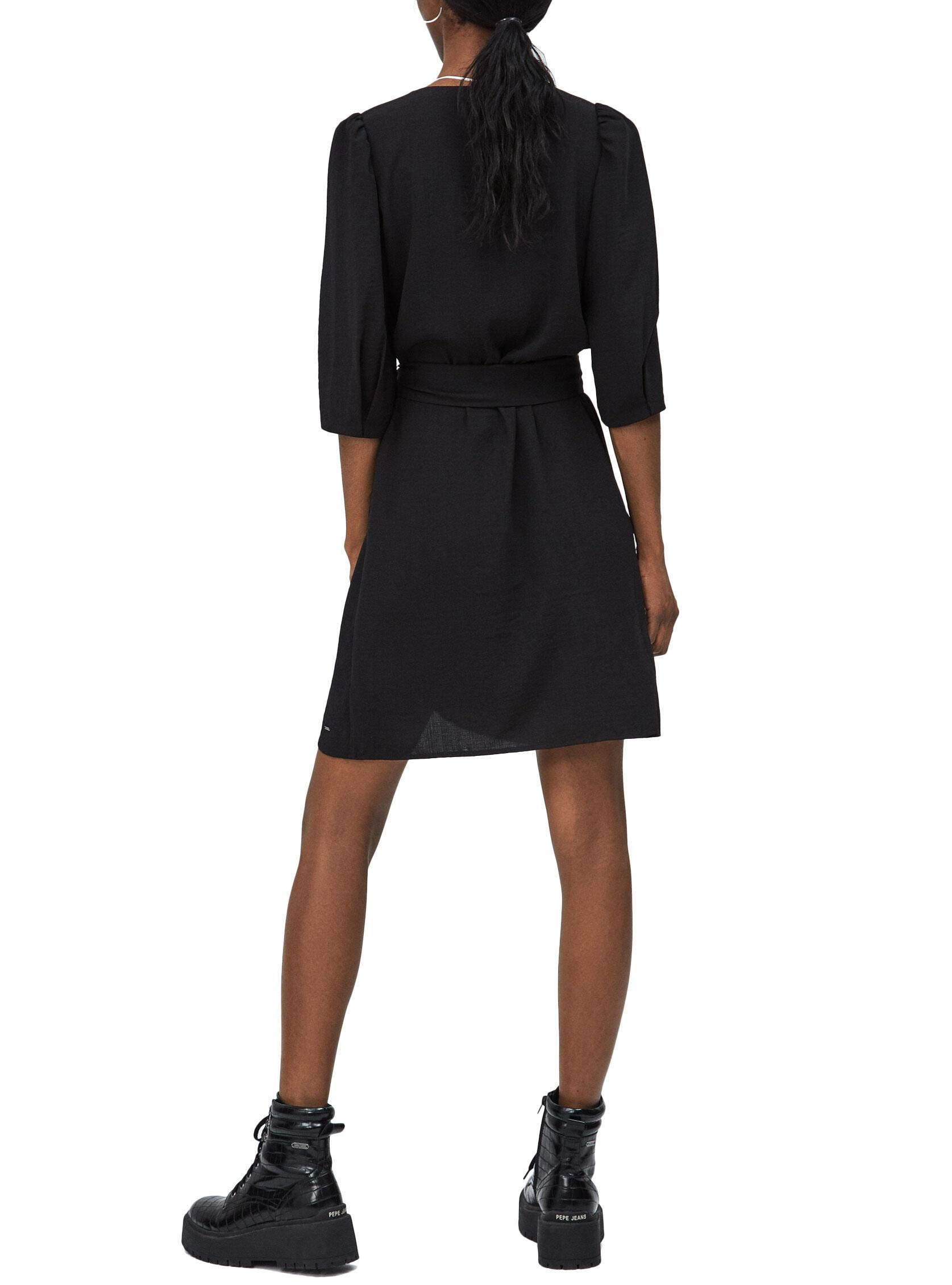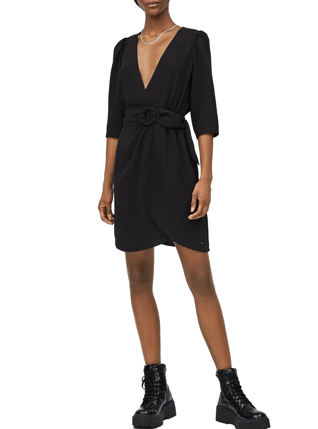Vestido Pepe Jeans. Modelo Lullu. Cor preta. Decote em V profundo. Saia cruzado. Cinto combinando com o vestido. Mangas 3/4. Ombros recolhidos. Logótipo metálico na bainha.