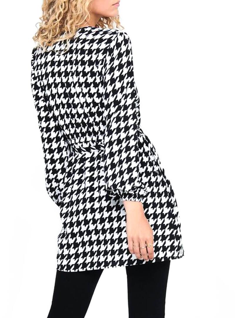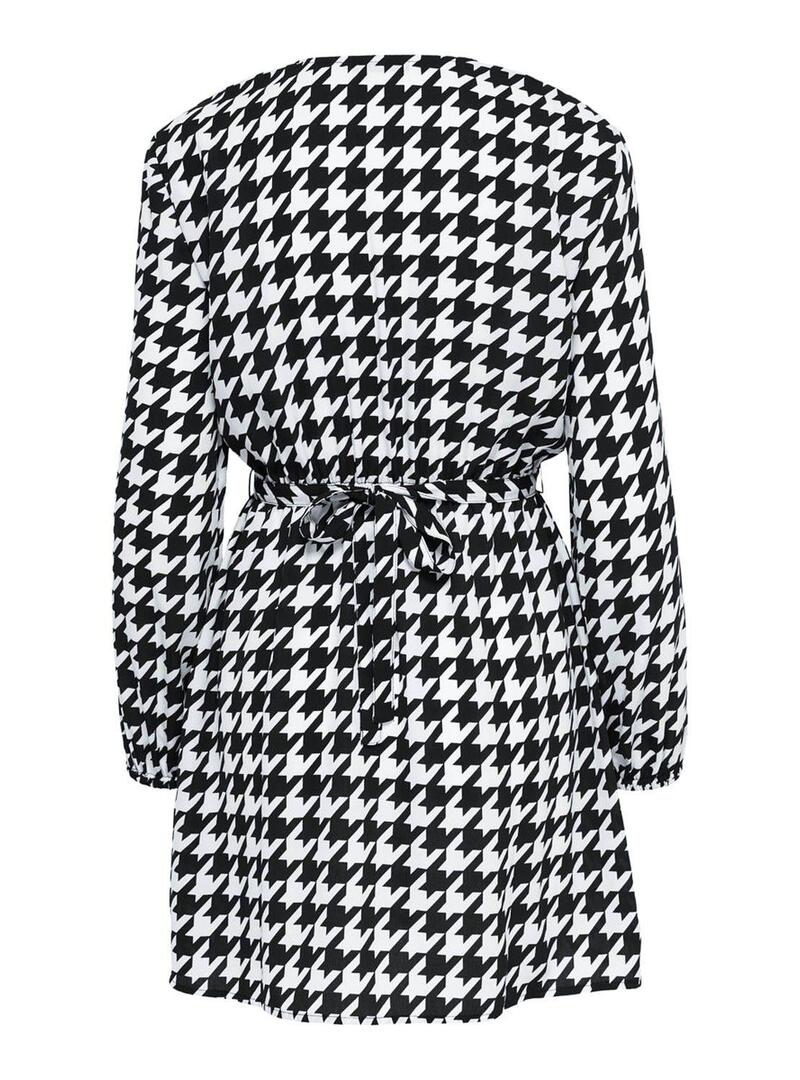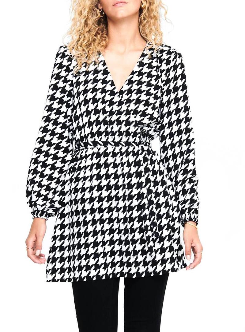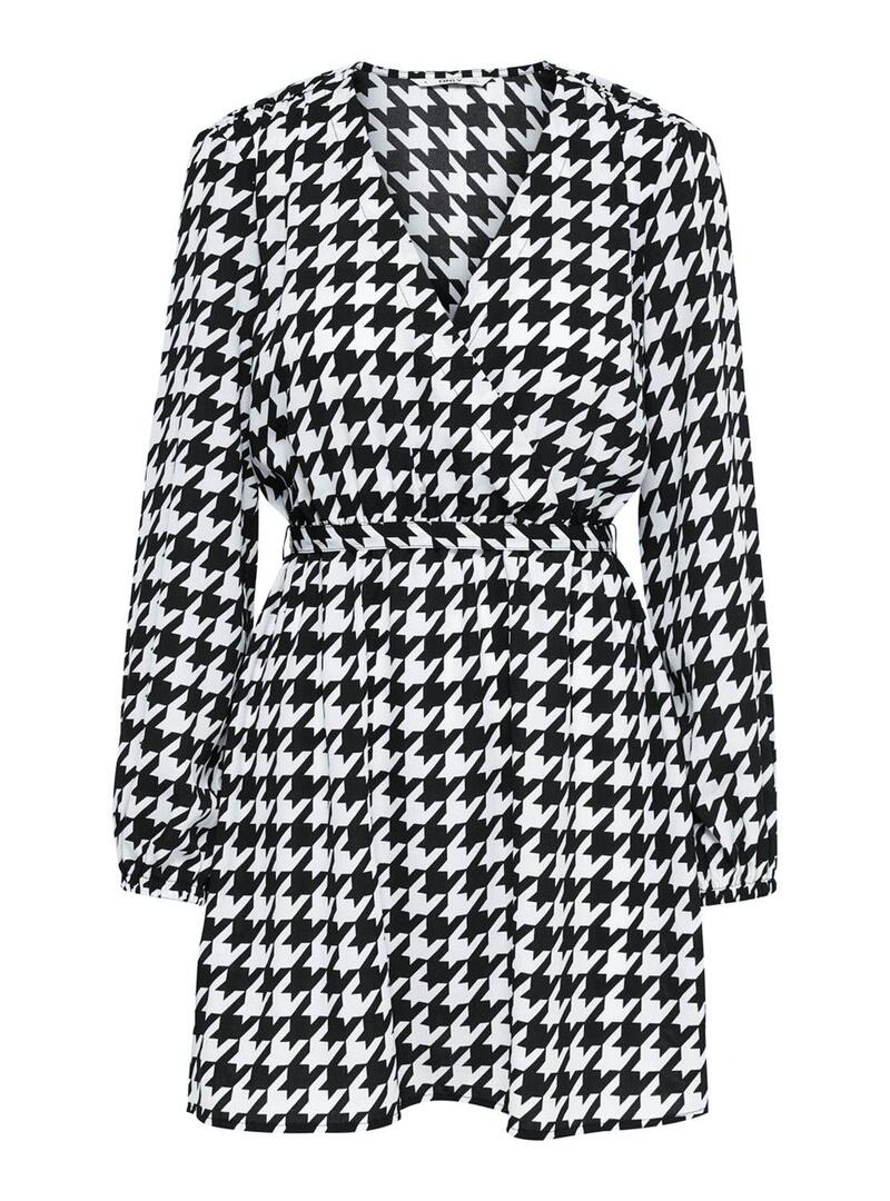 Vestido Only. Modelo flossy. Cor preto e branco. Impressão de pata igual. Decote cruzado. Mangas compridas bufantes. Cintura elástica. Mini quadra.