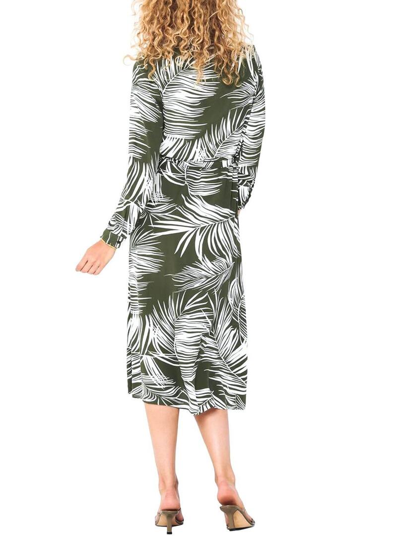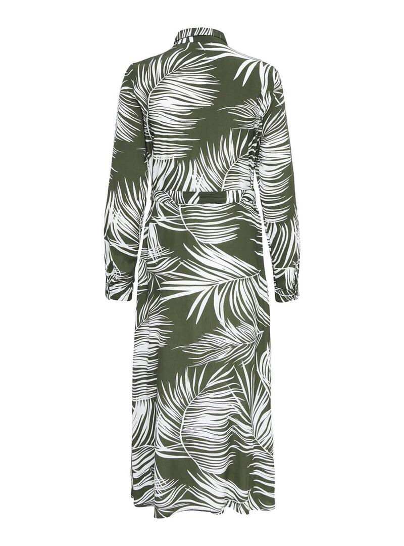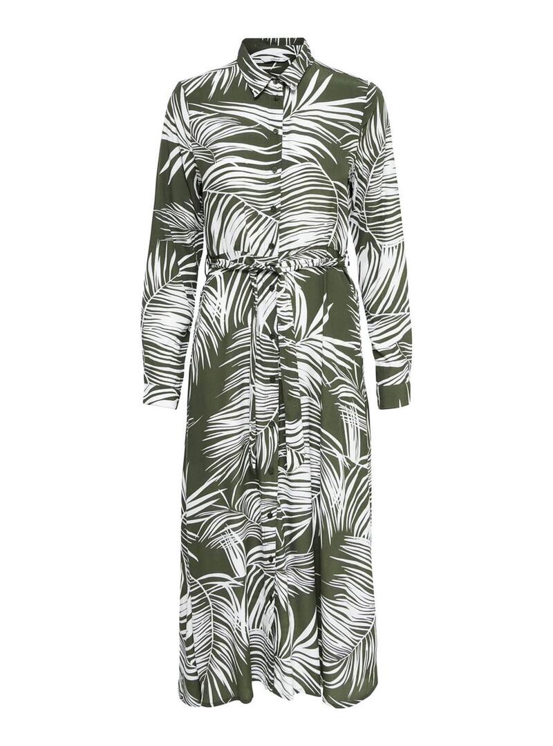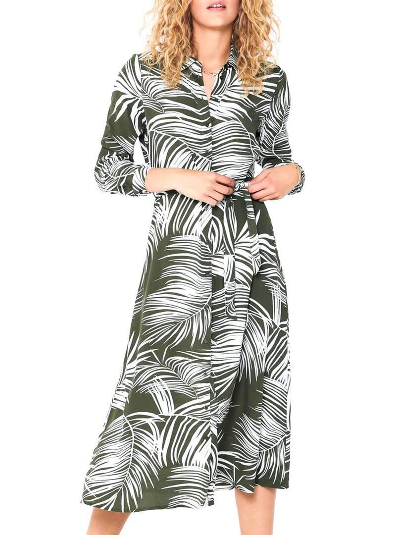 Vestido Only. Modelo Augustina. Cor verde. Fecho com botão frontal. Estilo de camisa. Cinto auto-atamento. Manga comprida. Acima do joelho. Tecido leve.