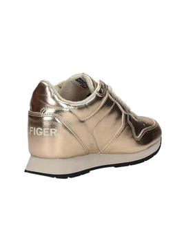 Sapatilhas Tommy Hilfiger. modelo mulher. Cor dourada. top sint da pele tica. sola de borracha. Estrelas ao lado. Logotipo na parte traseira.