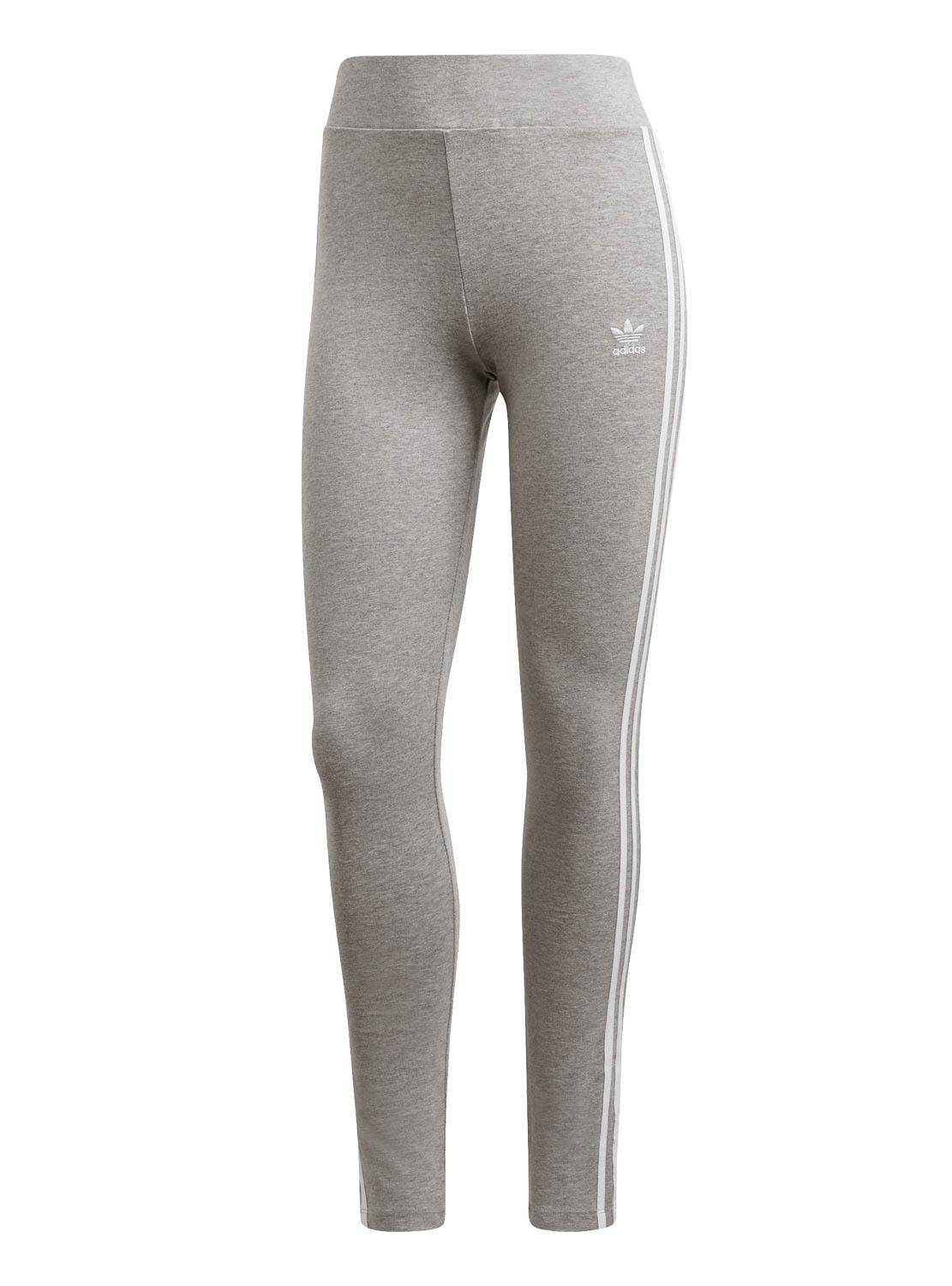 Legging Adidas. Modelo 3 Stripes. Cor cinzenta. Cintura elástica. Ajuste fino. Três Listras brancos na lateral. Logótipo bordado na anca. Tecido elástico.