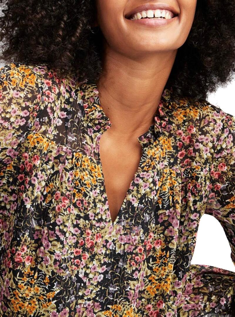 Vestido Naf Naf. Estampa floral. Manga comprida. Gola V. Tecido fluido. Revestimento interno. Detalhes de fio metálico. Mini babados nas mangas. A modelo usa um tamanho 36.