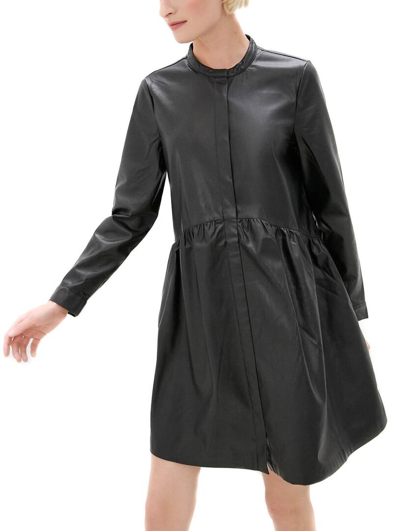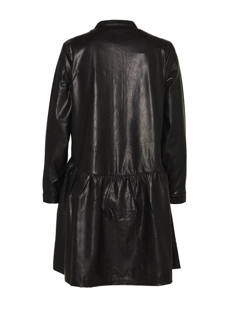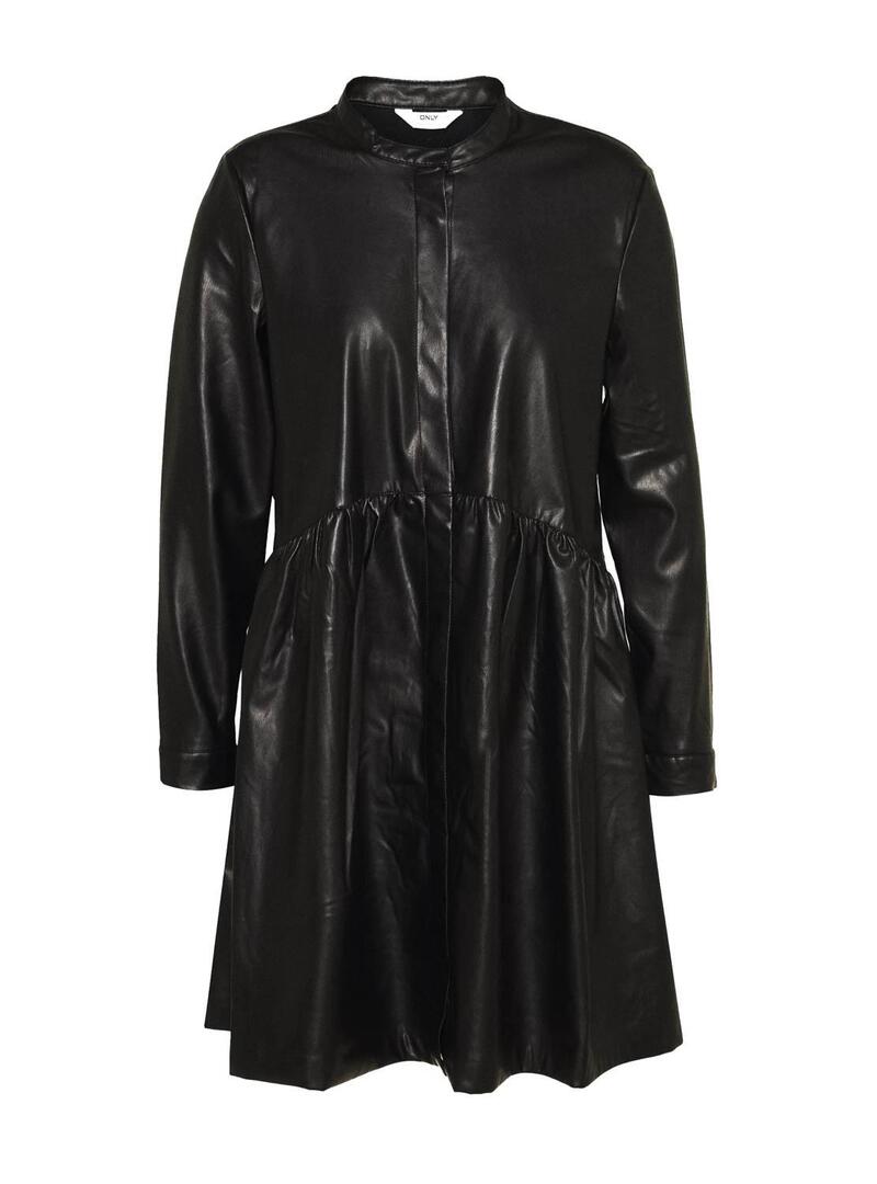 Vestido Only. Modelo de Chicago. Cor preta. Fechamento de botão. Manga comprida. Saia com vôo. Tecido de couro sintético. Mini corte.