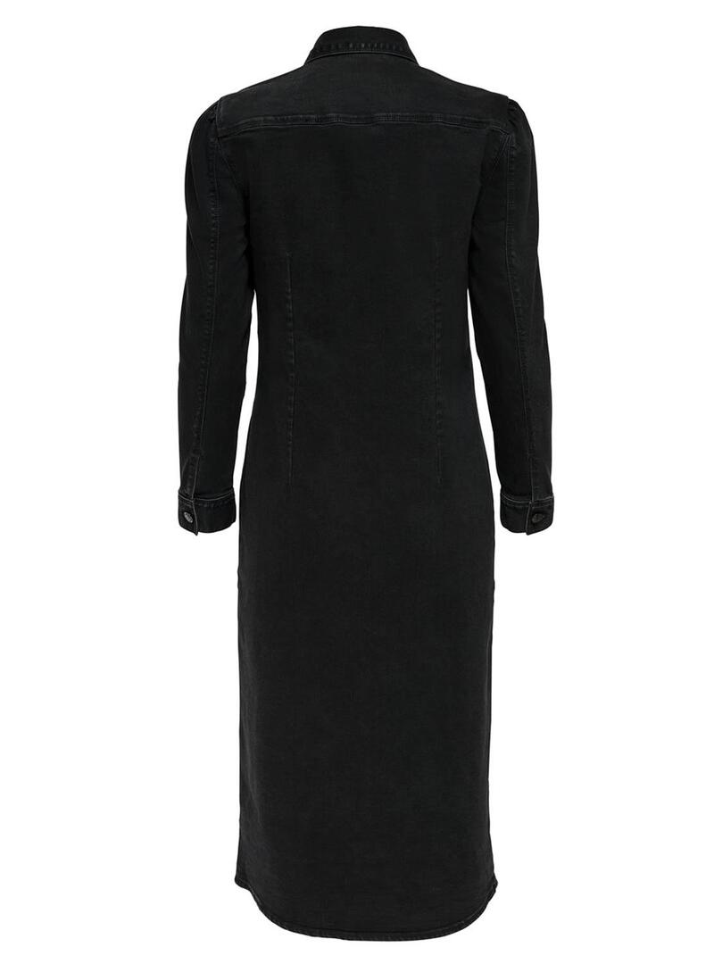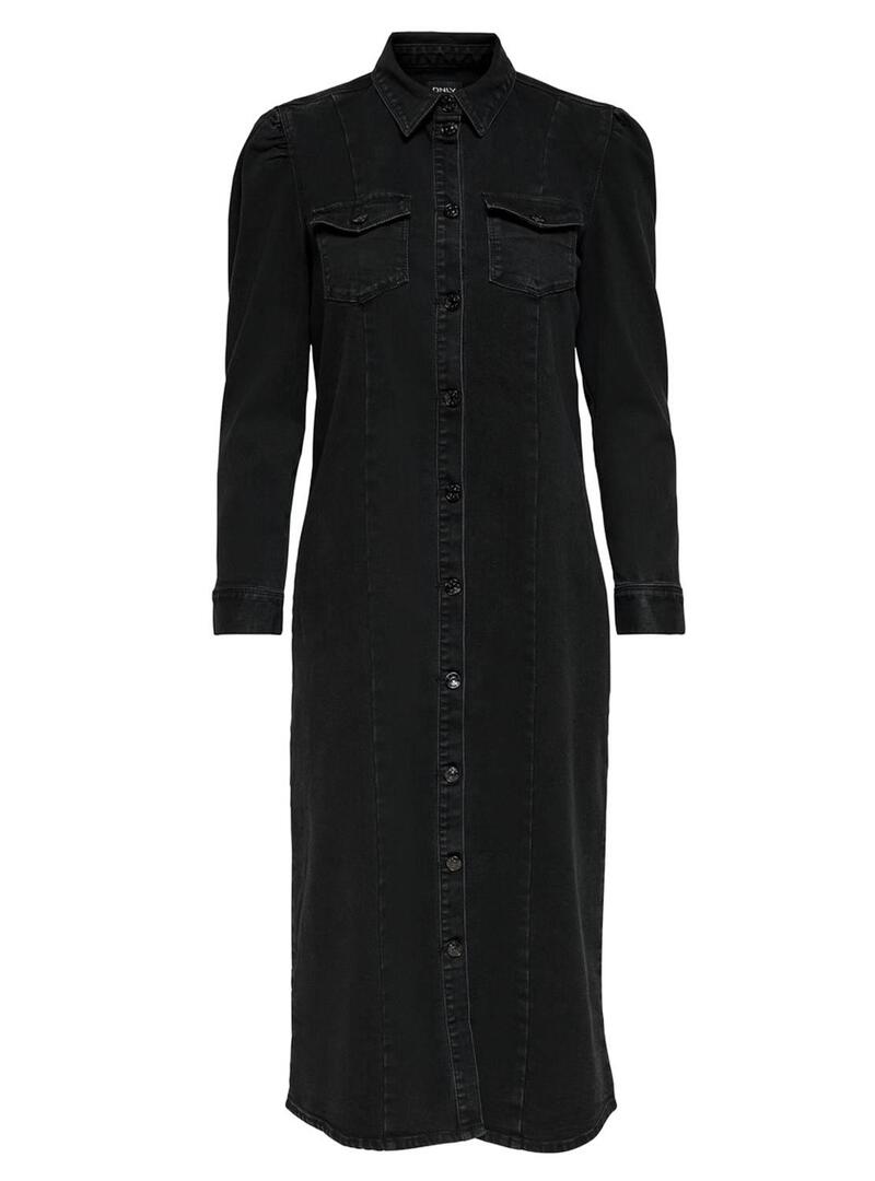 Vestido Only. Modelo Mette. Cor preta. Fecho de botão de metal. Comprimento do joelho. Bolsos no peito. Mangas compridas bufantes. Ajuste fino. Tecido denim.