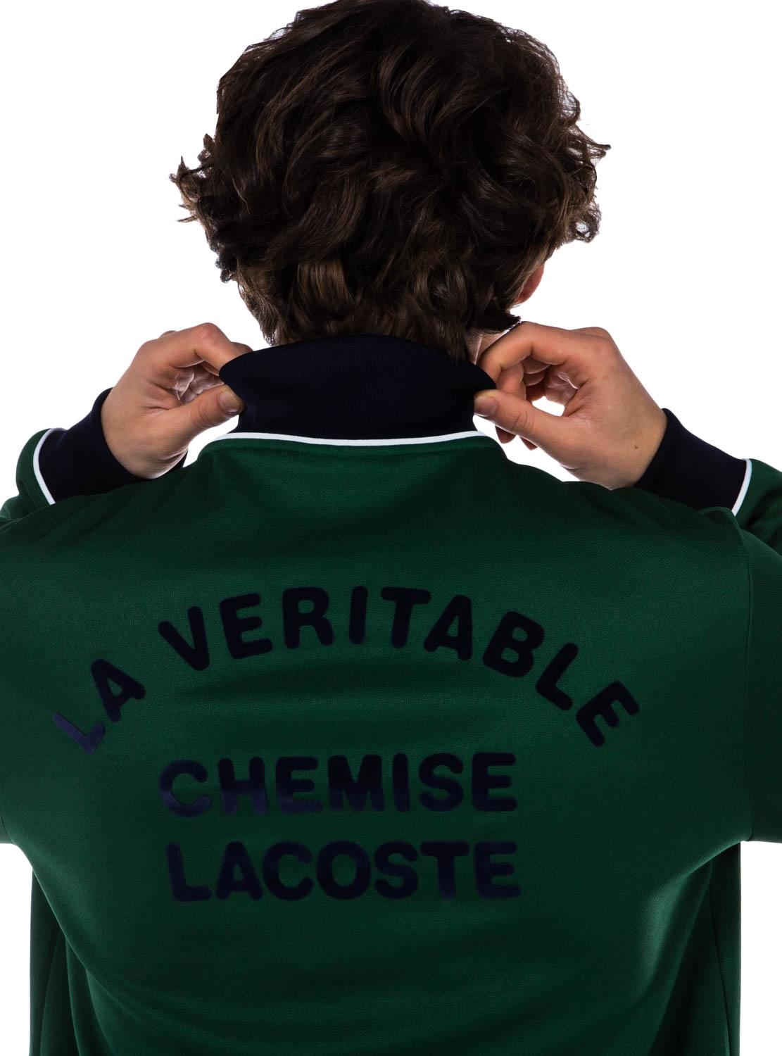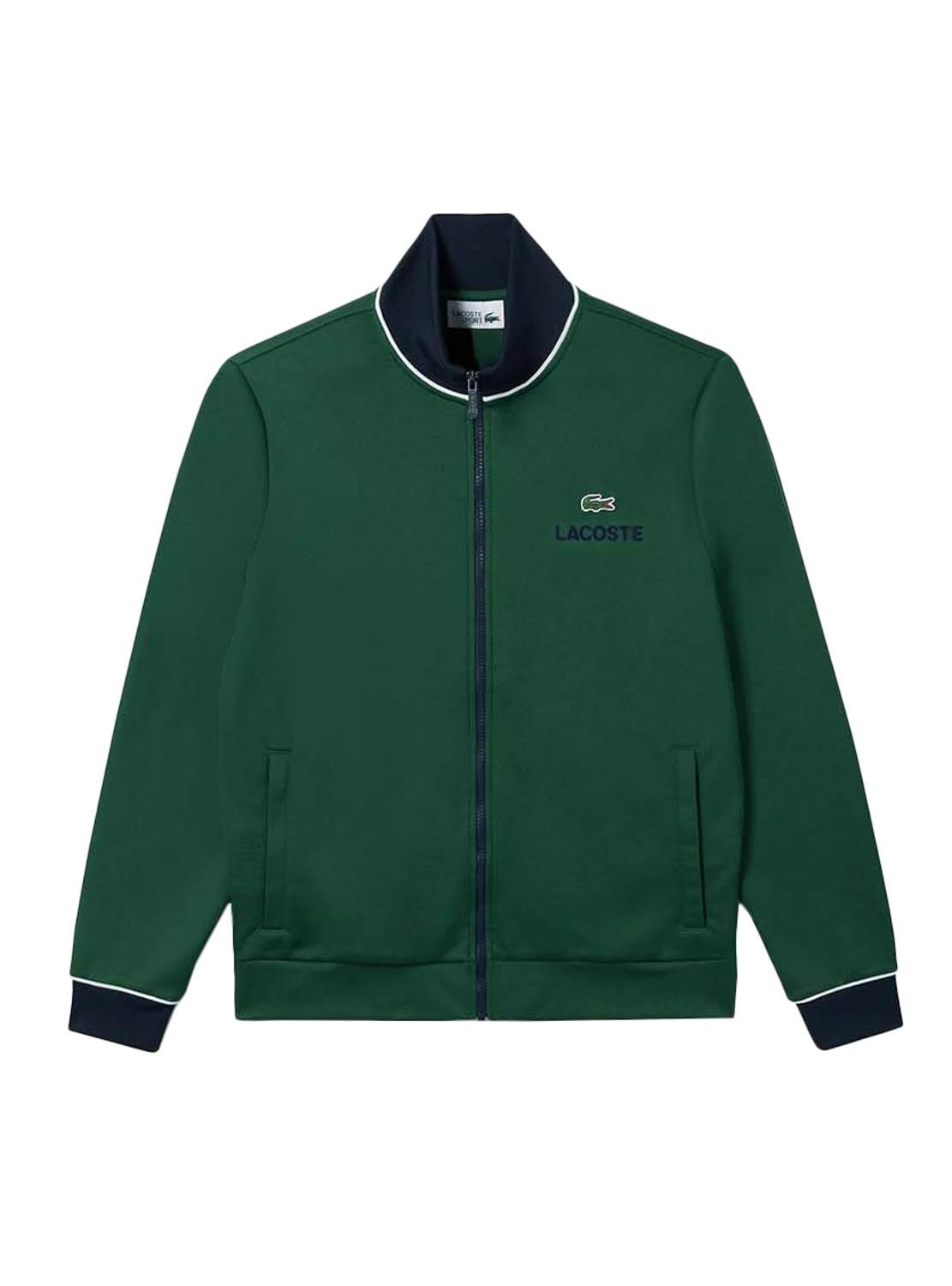 Casaca Lacoste Sport. Cor verde. Fecho com zíper. Estriado nas extremidades. Gola e punhos azul marinho. Logótipo no peito. Frase estampada nas costas. Bolsos laterais. Pescoço longo.