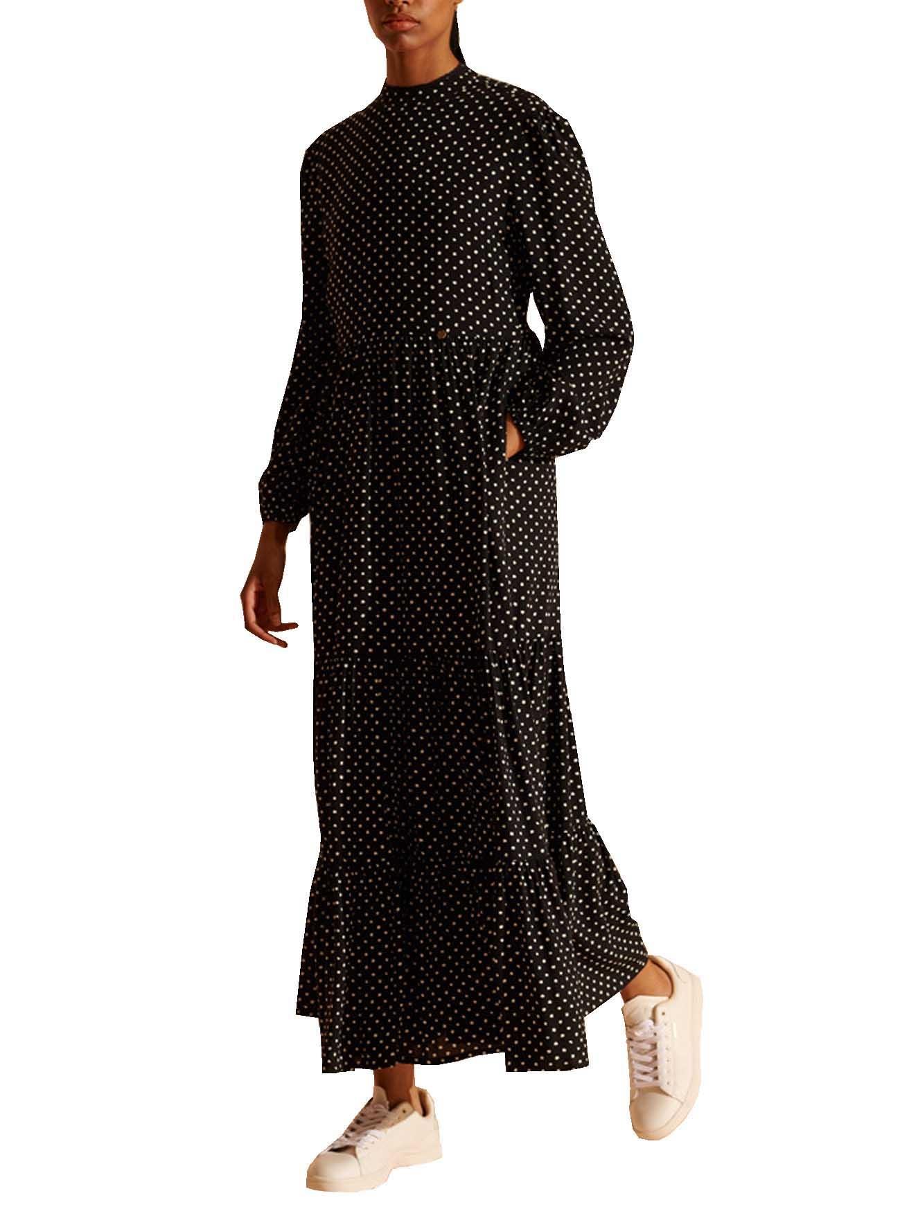 Vestido Superdry. Modelo Skylar. Cor preta. Pescoço redondo. Mangas compridas bufantes. Corte Maxi. Saia com babados. Tecido fluido. Impressão de bolinhas brancas. Logótipo metálico na cintura.