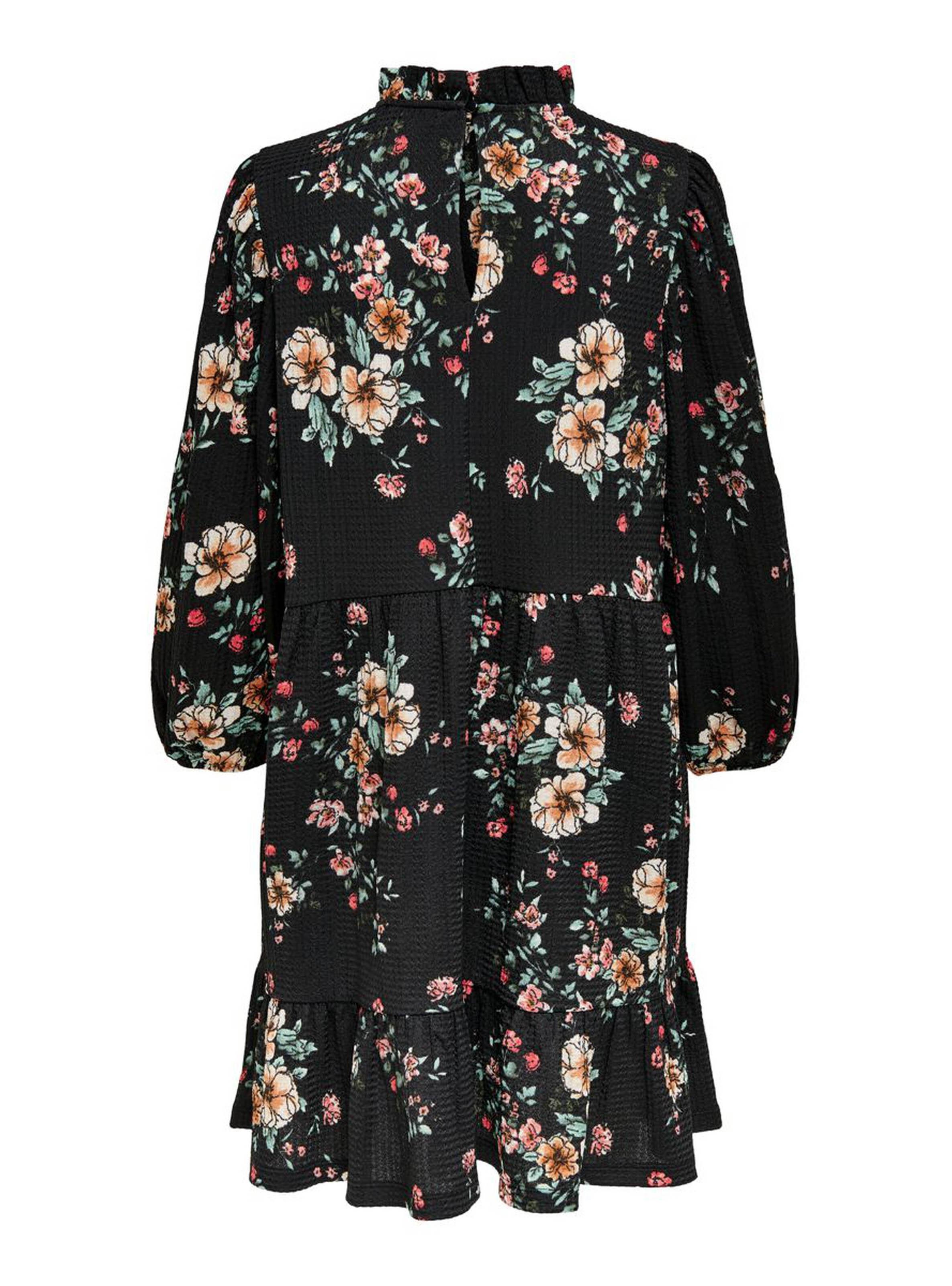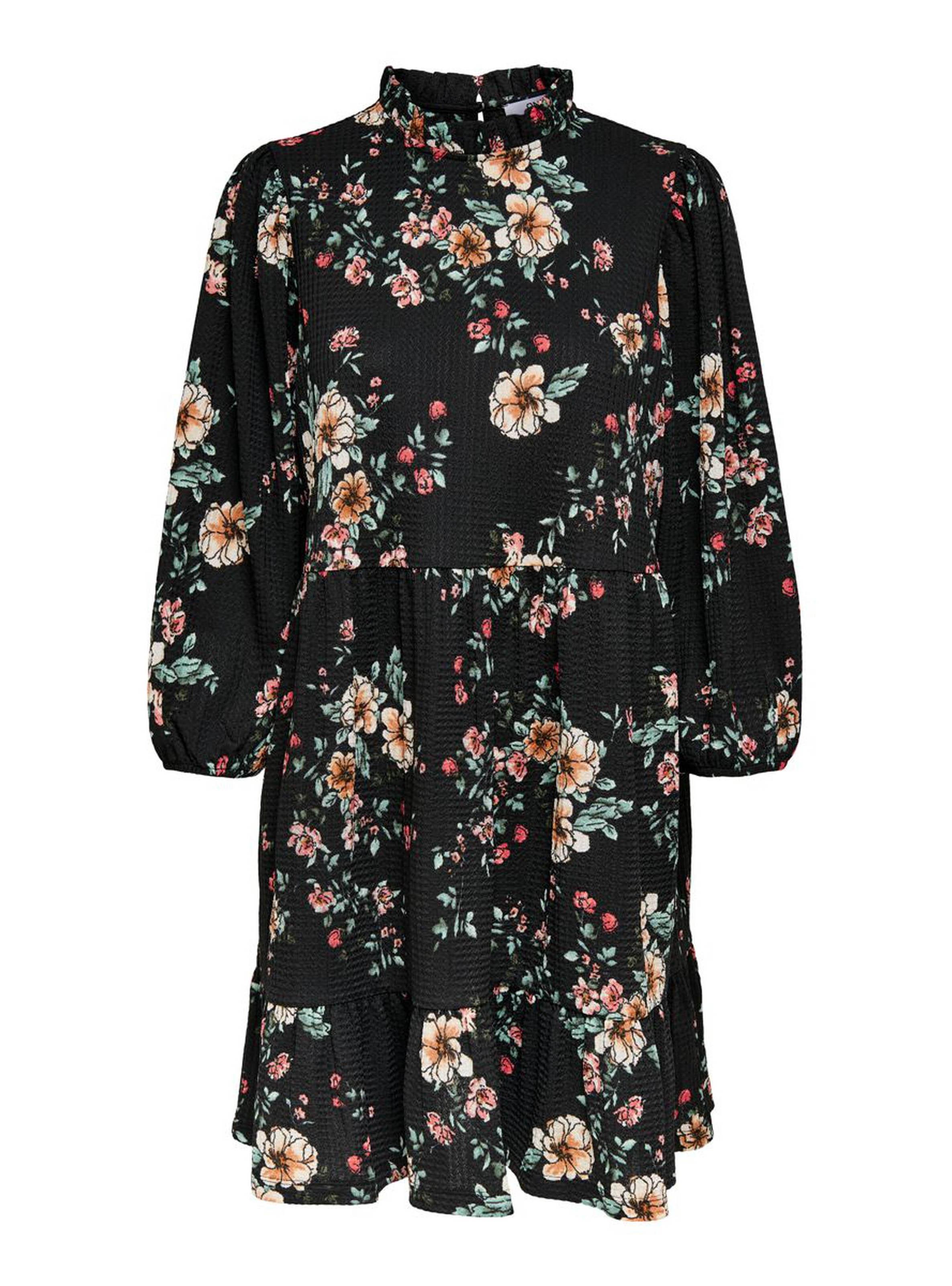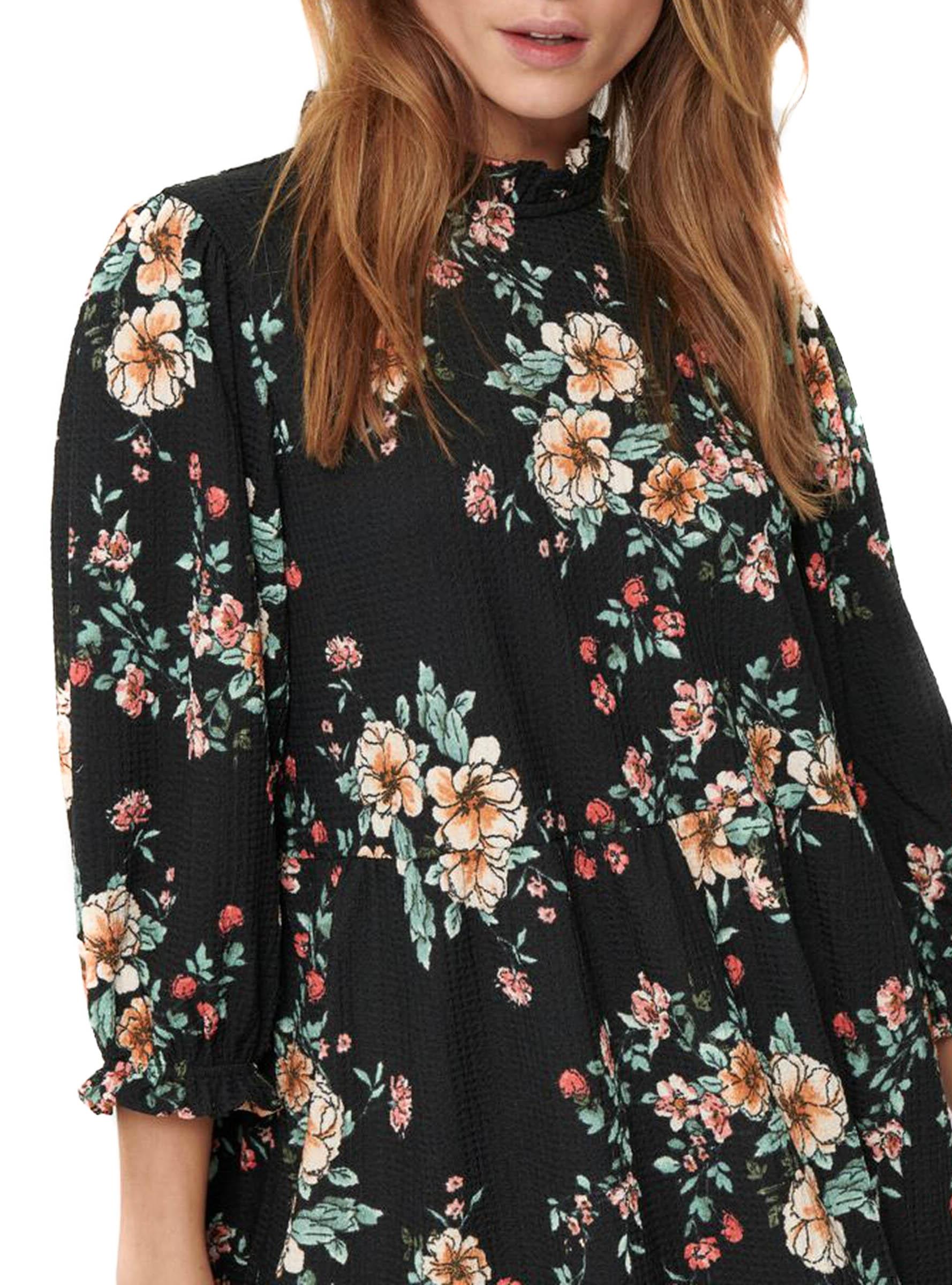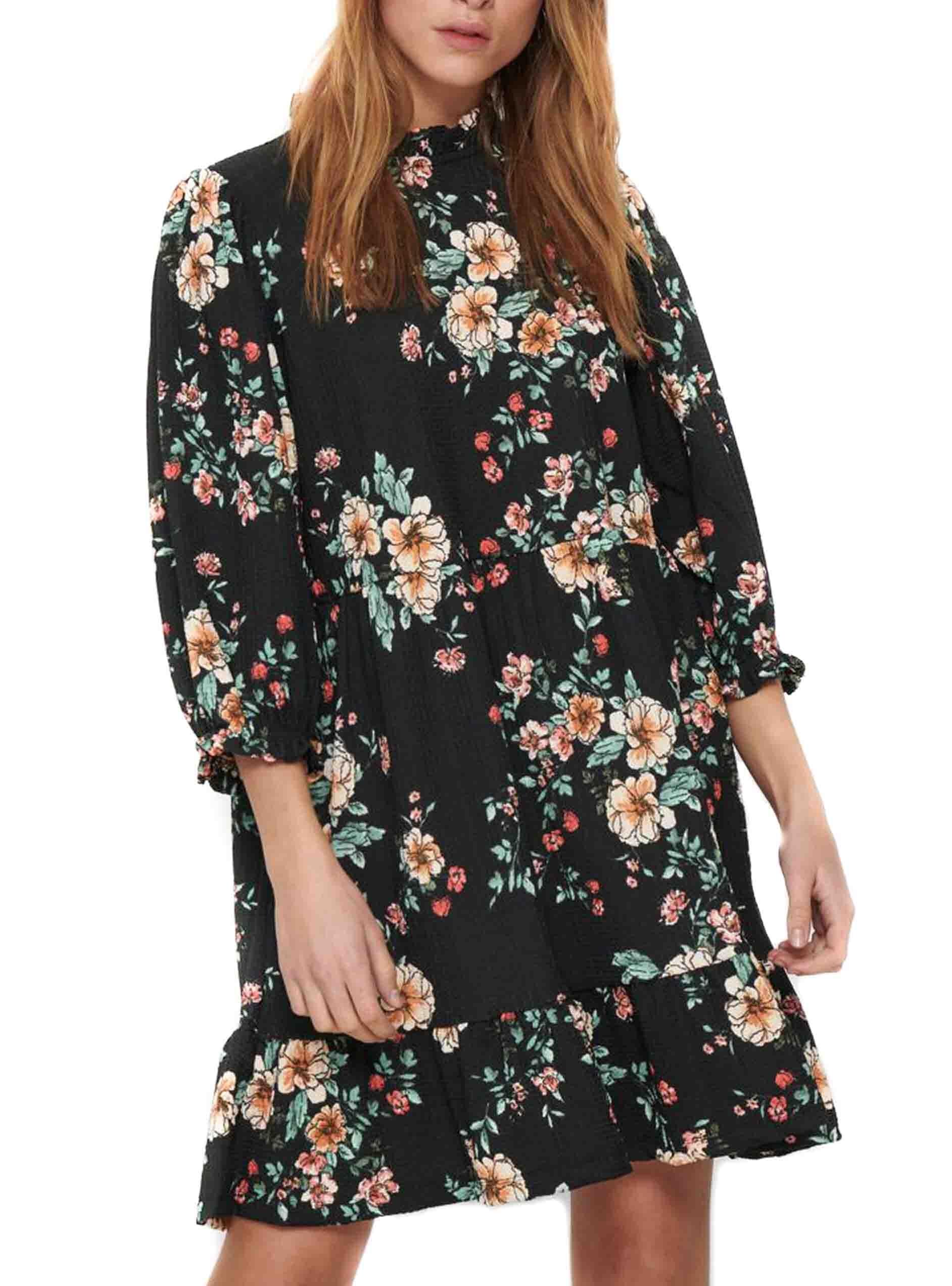 Vestido Only. Modelo Zille naya. Cor preta. Curto. Pescoço longo. Babados decorativos. Ajuste solto. A modelo usa um tamanho S.