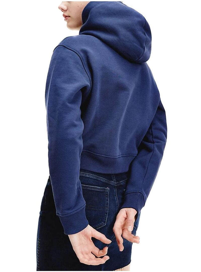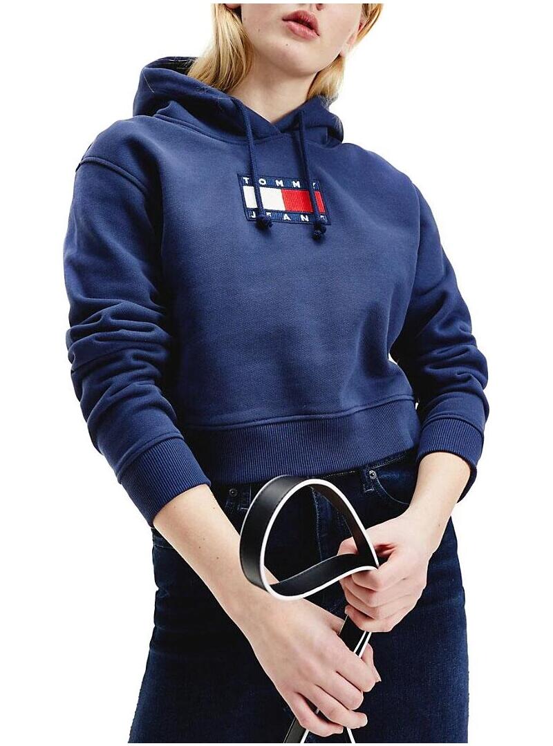 Sweat Calça jeans Tommy. Cor azul. Logótipo no peito. Capuz ajustável com atacadores. Punhos e bainha nervurados. Corte cropped. A modelo usa tamanho S.