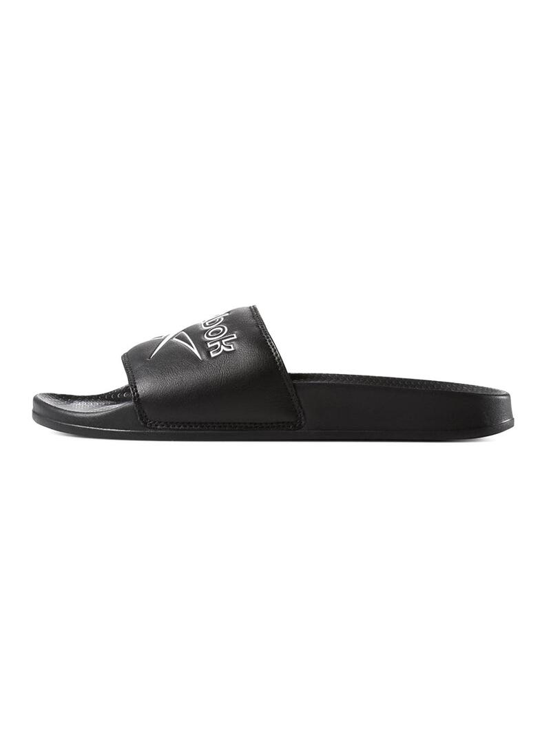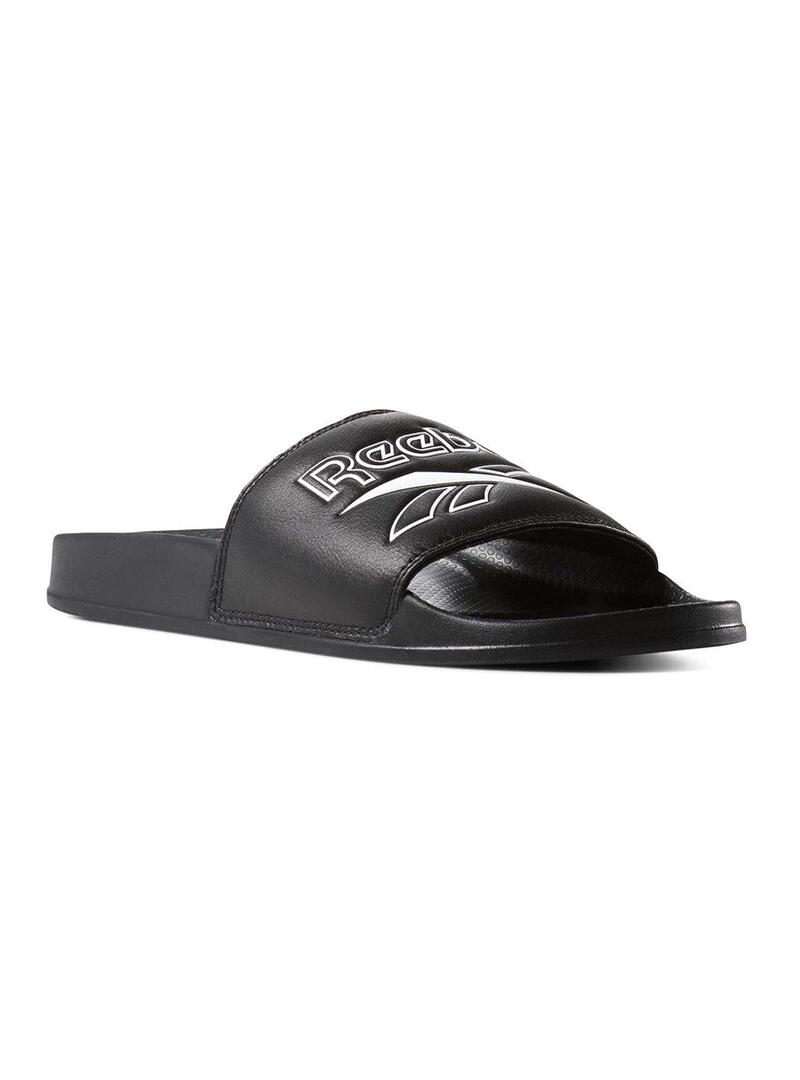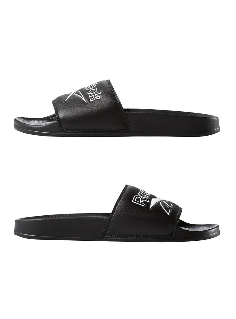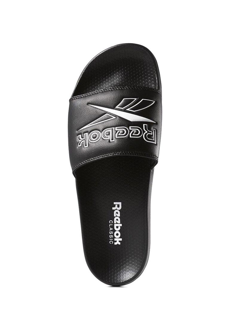 Reebok flip flops. Modelo Classic. Cor preta. Alça larga. Top sintético. Logo da marca no topo.