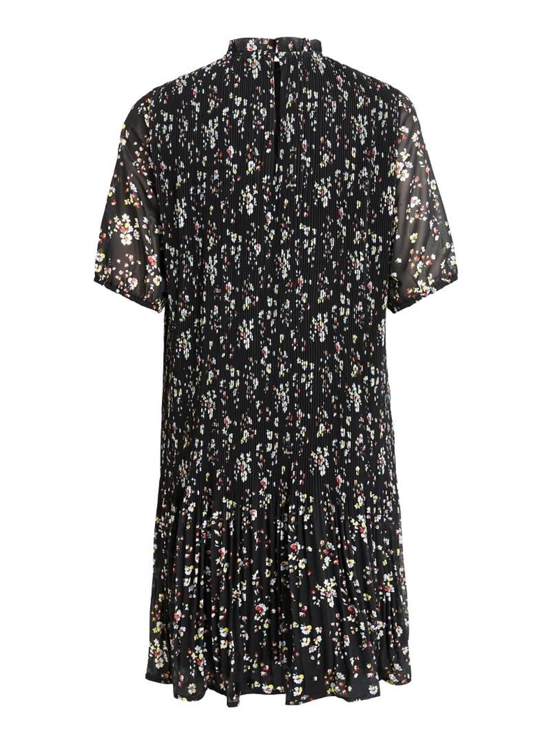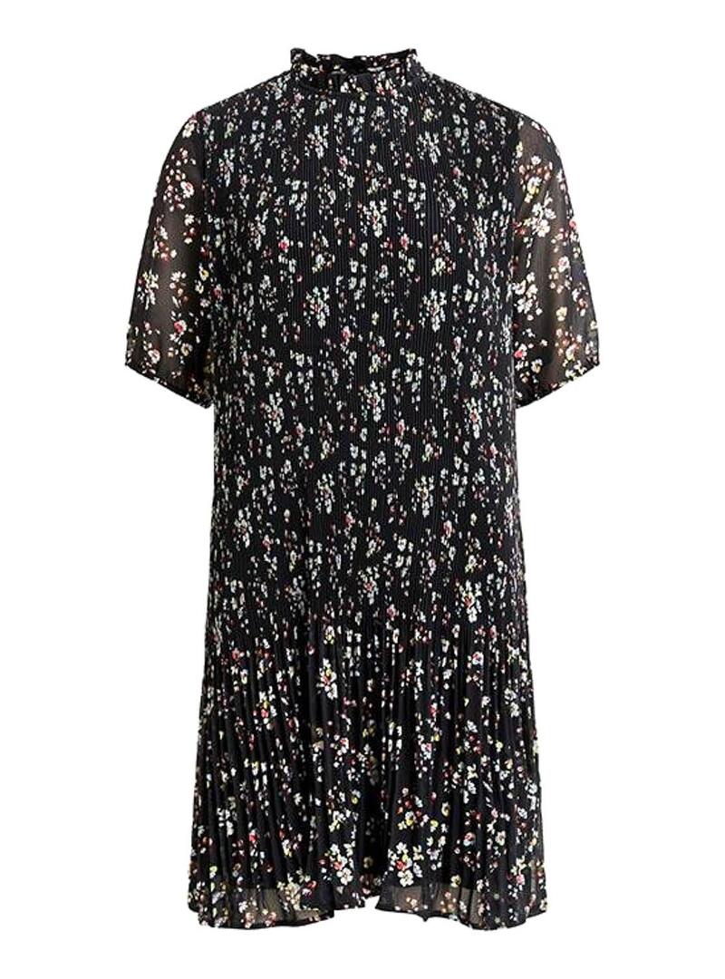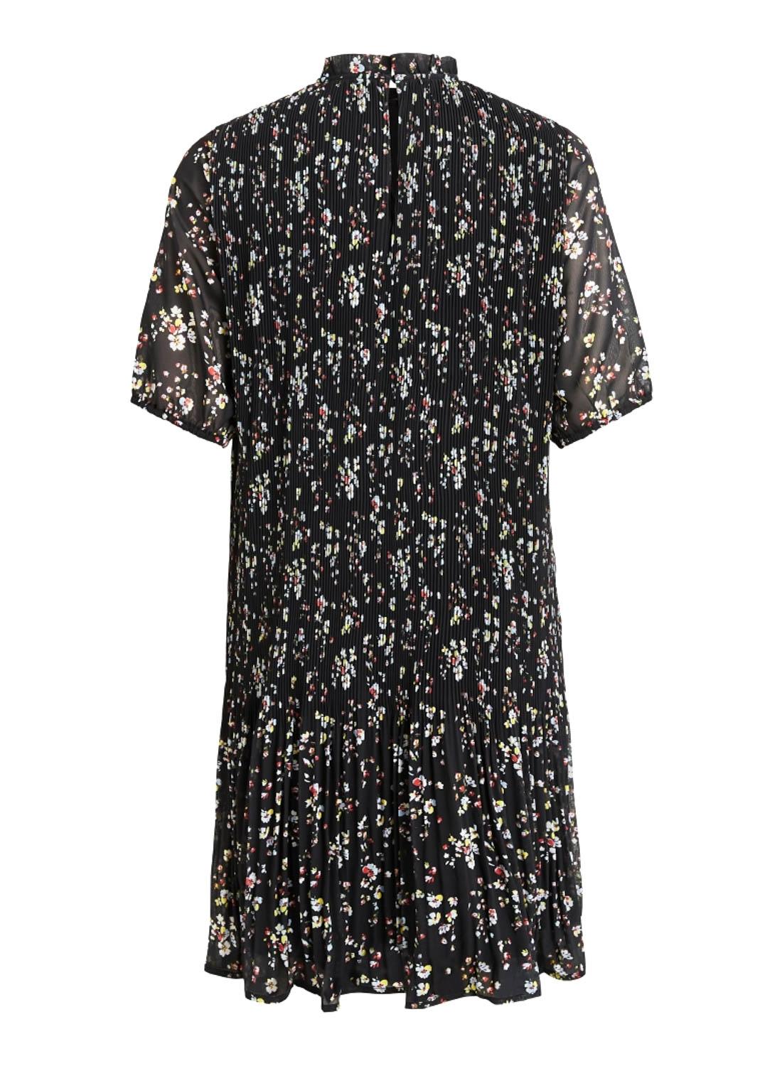 Vestido Vila. Modelo de Viblossoms. Cor preta. Estampa floral. Pescoço longo. Fechamento de botão. Manga curta. Plissado. Material elástico. Comprimento do joelho. 100 cm de comprimento no tamanho 38.