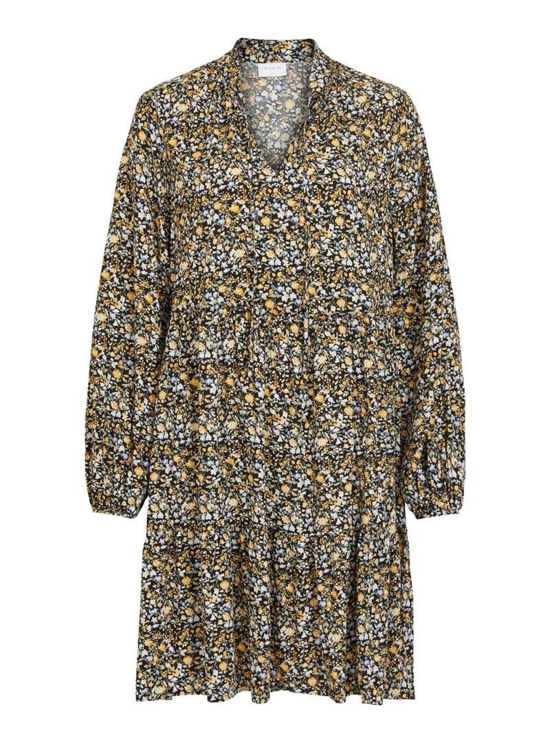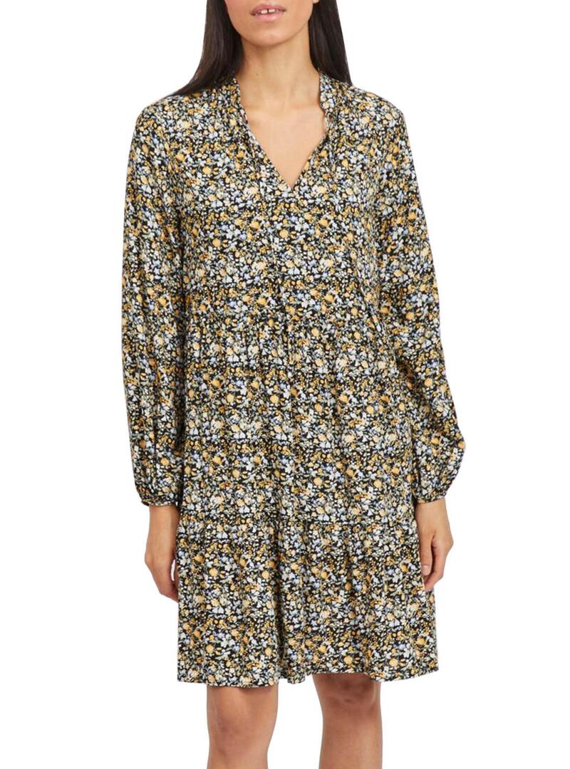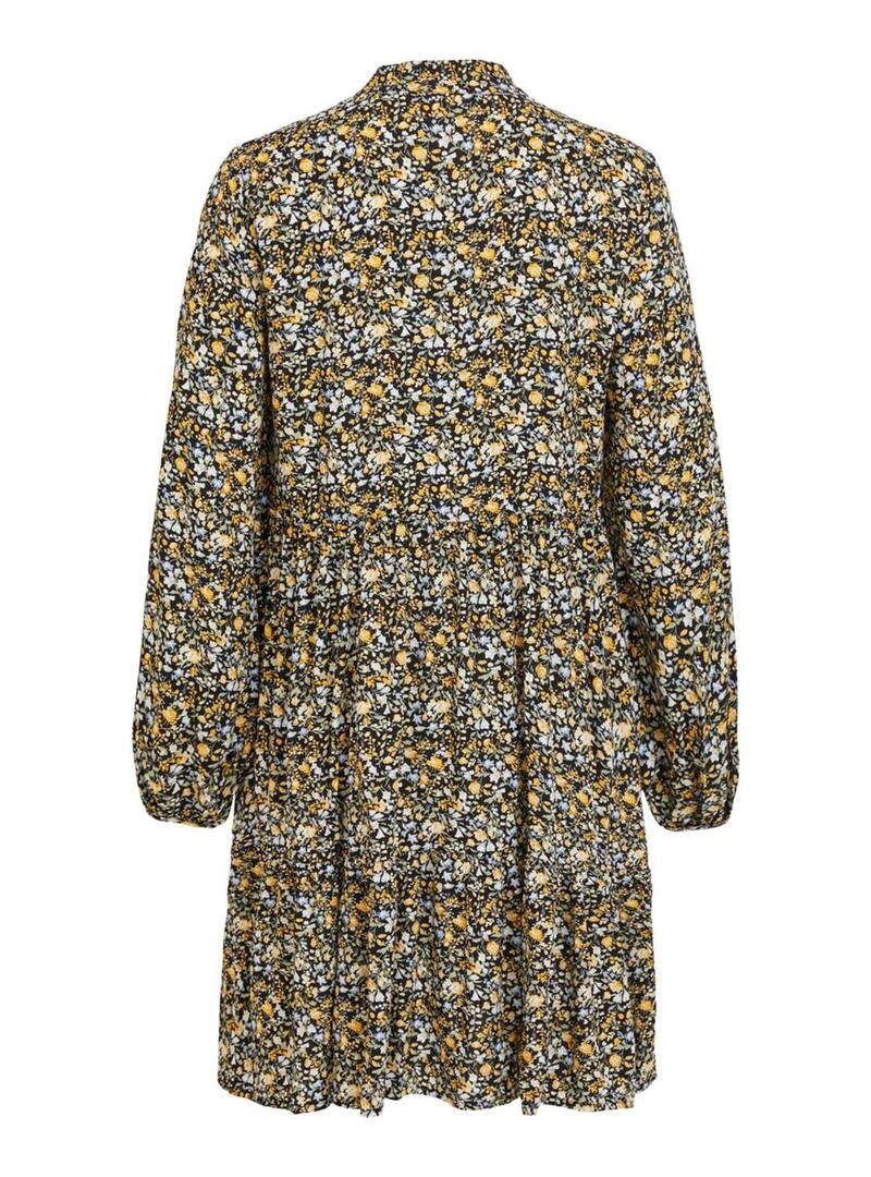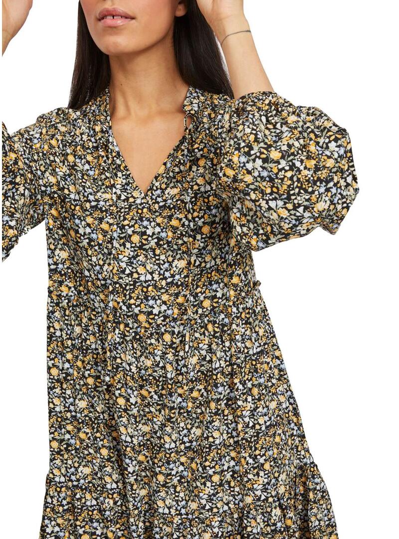 Vestido Vila. Modelo Vitendi Tullan. Padrão de flores. Manga comprida. Laços no pescoço. A modelo usa tamanho 38.
