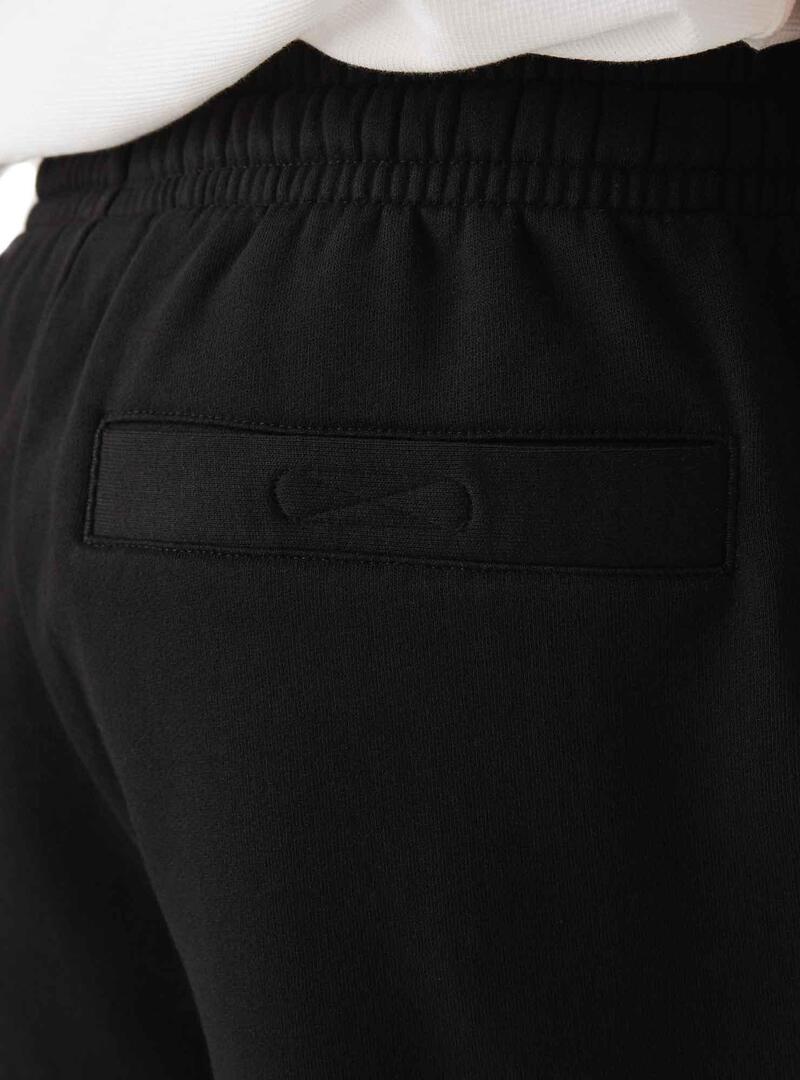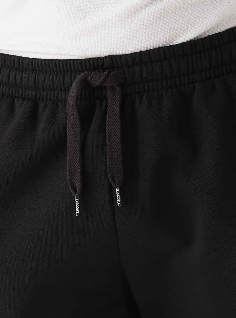 Bermuda Lacoste Sport. Modelo de tênis. Cor preta. Tecido de algodão aveludado. Cintura elástica. Fecho com cadarço. Logótipo na bainha. A modelo usa tamanho 4.