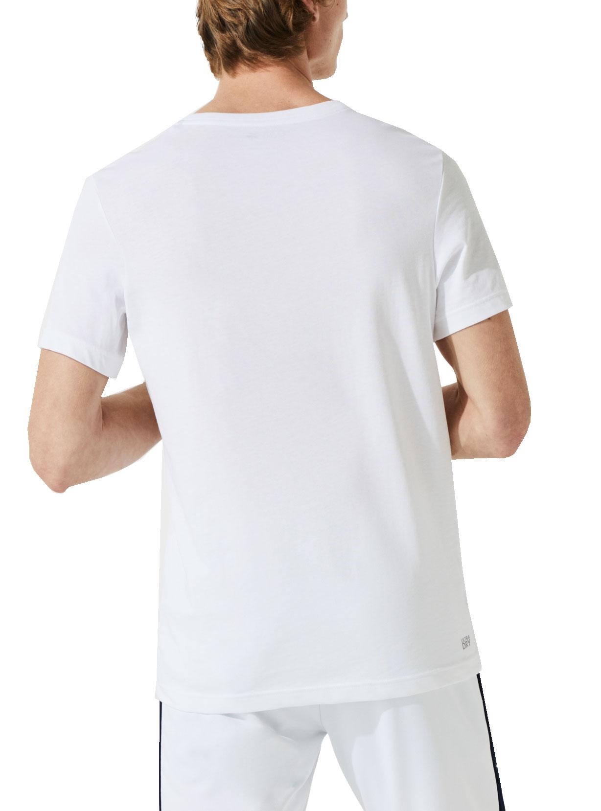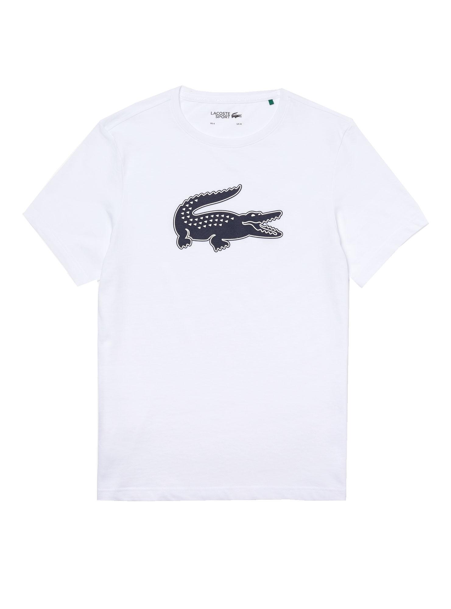 T-Shirt Lacoste. Cor branca. Gola redonda nervurada. Tecido de malha técnica. Logótipo impresso no peito a azul.