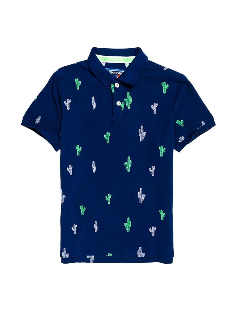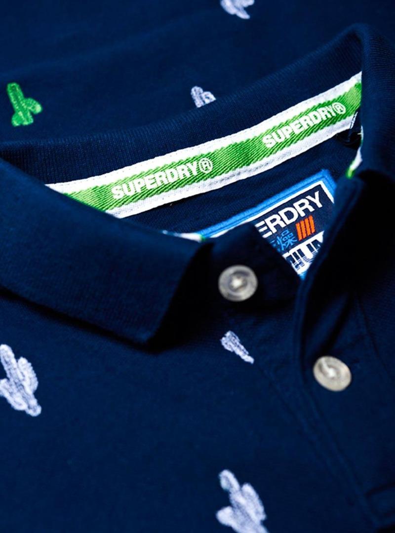 Polo Superdry. Cor azul marinho. Projetar ou imprimir com cactus. Colarinho abotoado. Manga curta. Ajuste regular. O modelo usa tamanho M.