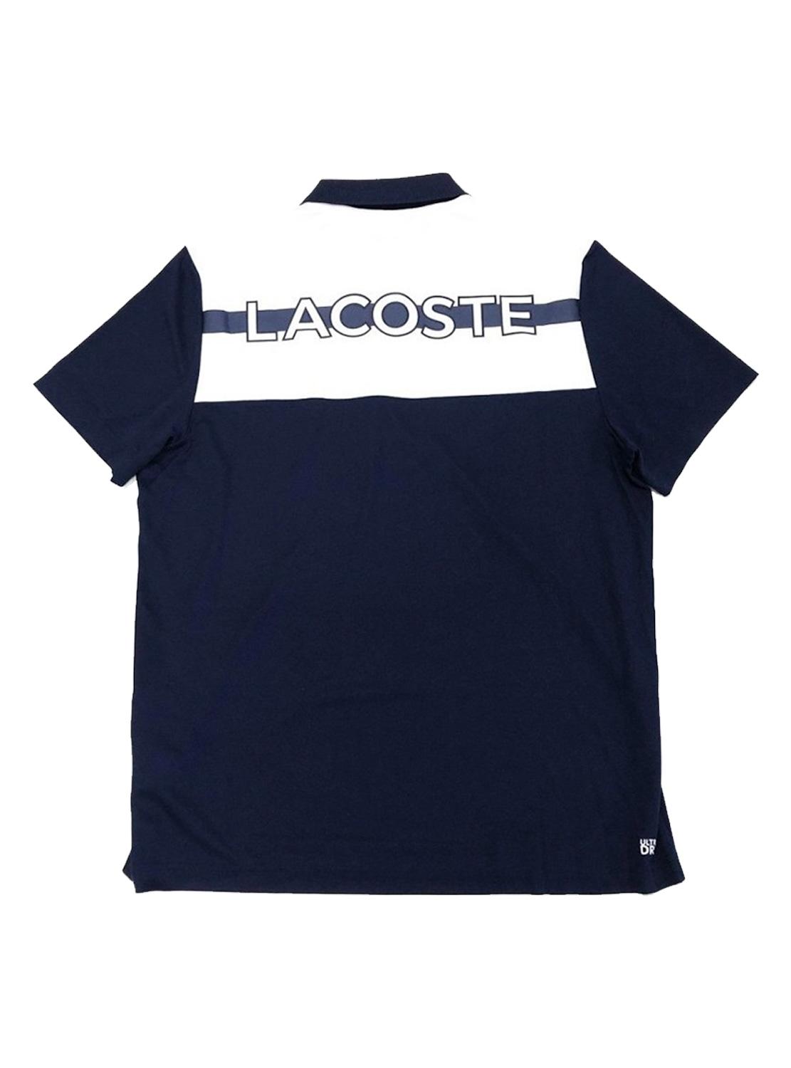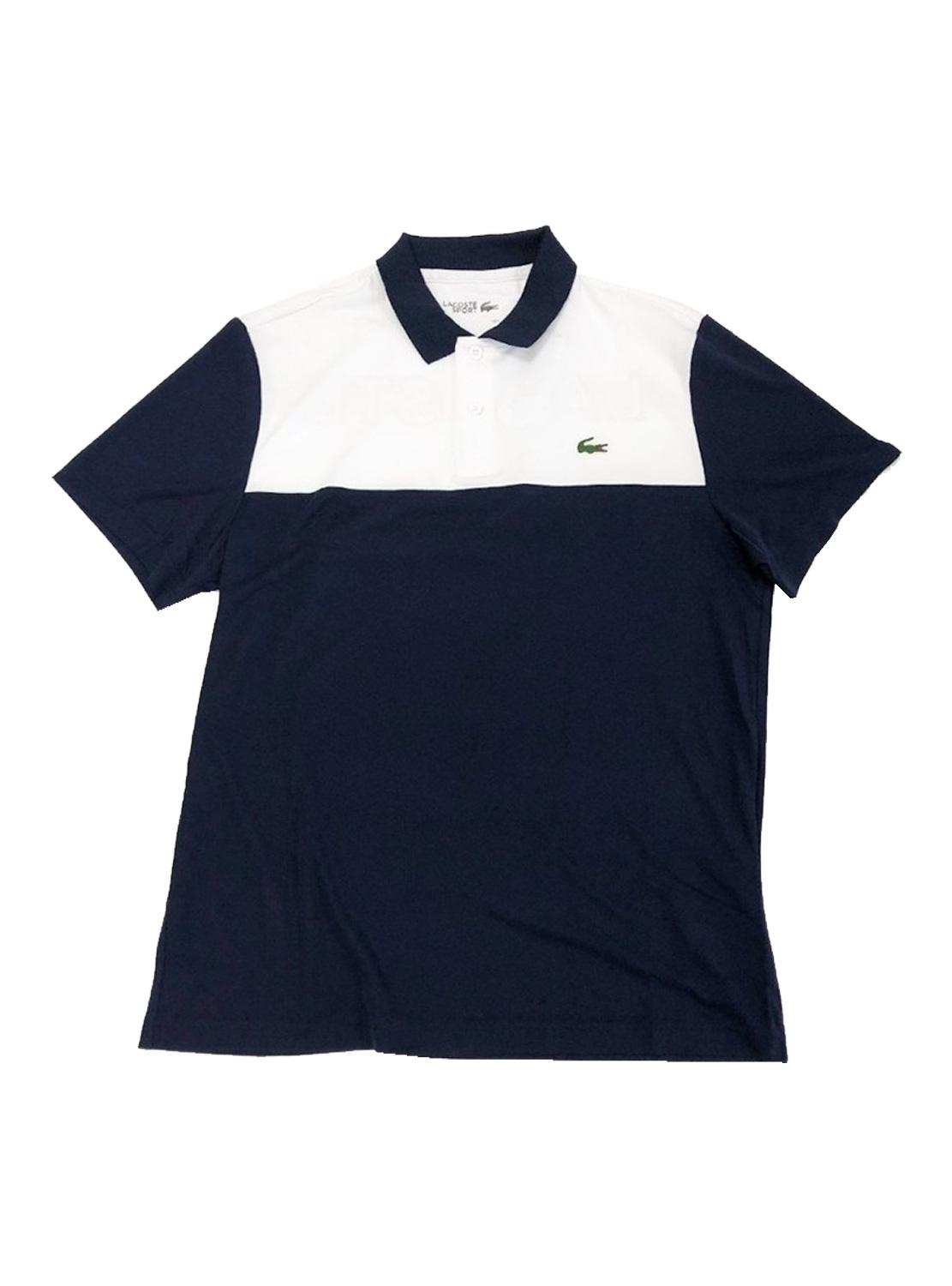 Polo Lacoste. Tecido de poliéster ultra dry. Bloco de cores azul marinho e branco. Manga curta. Gola polo nervurada. Tapeta com dois botões. Logótipo no peito e nas costas.