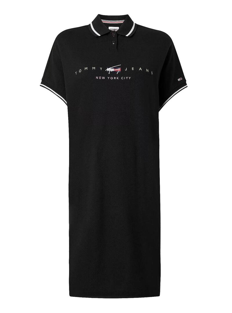 Vestido Tommy Jeans. Modelo Modern Logo Polo. Cor preta. Manga curta. Gola e mangas caneladas. Gola pólo de dois botões. Impressão do logotipo no peito. Comprimento do joelho.