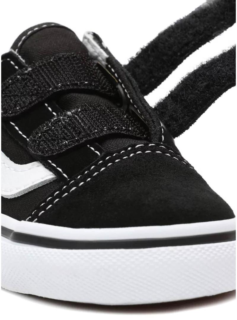 Sapatilhas Vans. Antigo modelo Skool Velcro. Cor preta. Couro superior. Fechamento de velcro. Colarinho acolchoado. Sola de waffle de borracha.