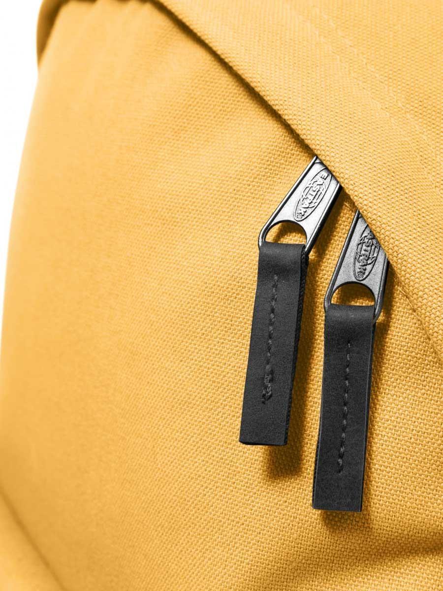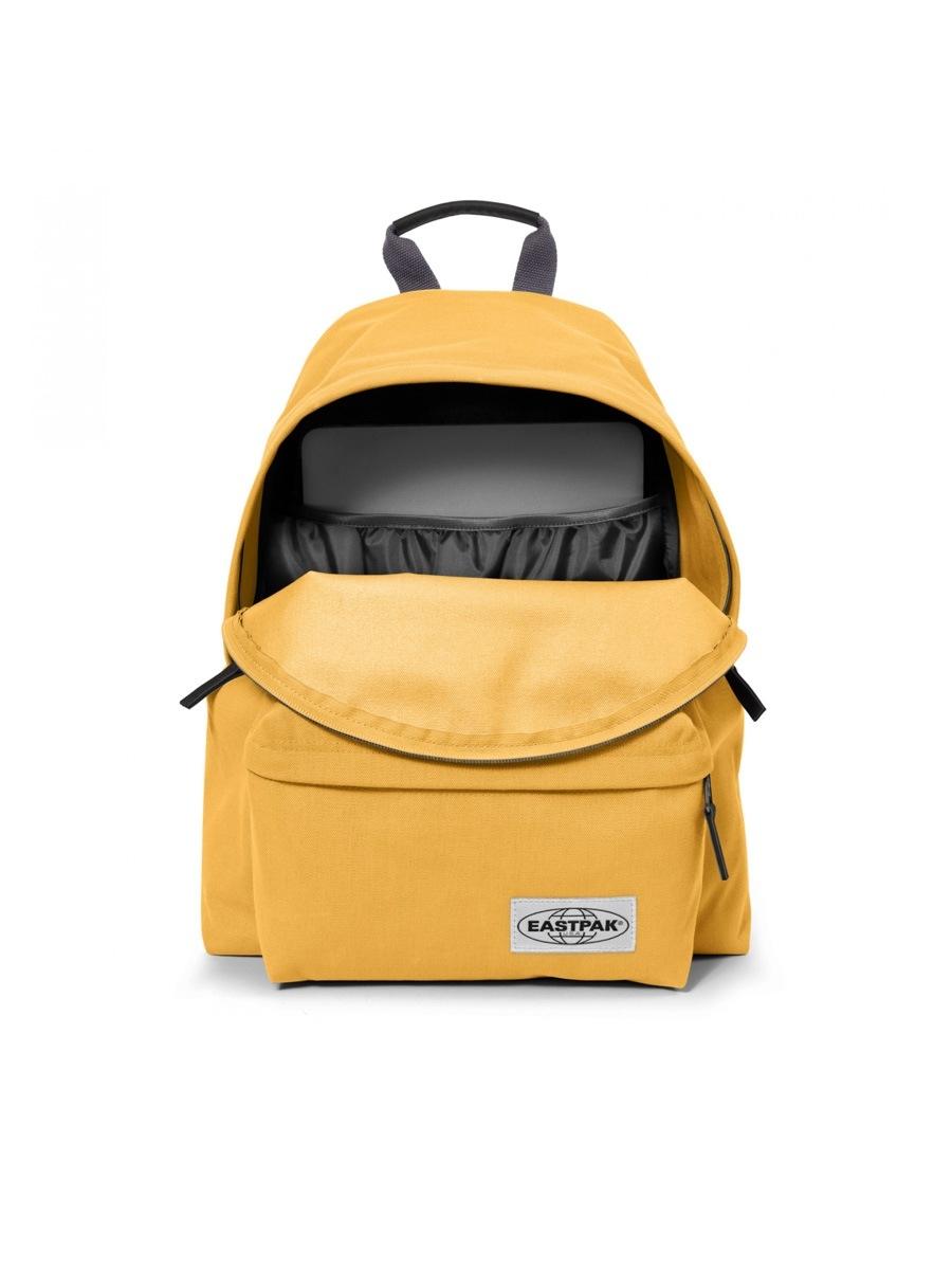 Mochila EastPak. Modelo Padded Pak R. Cor amarela. Altura: 40cm, largura: 30cm, profundidade: 18cm. Painel traseiro acolchoado e alças. bolso externo. Etiqueta do logotipo no bolso. Alça ajustável. Fecho de correr.