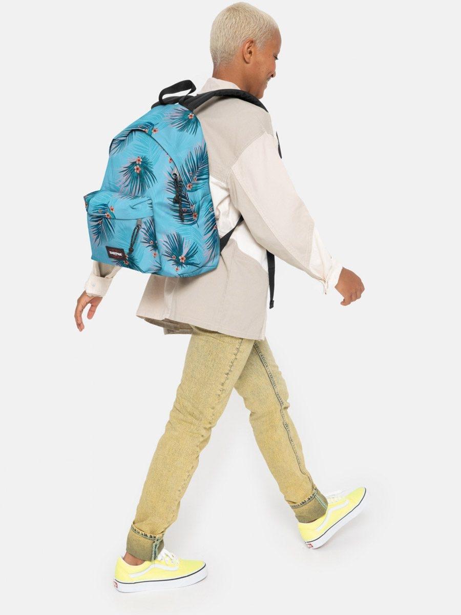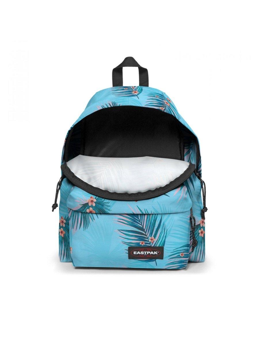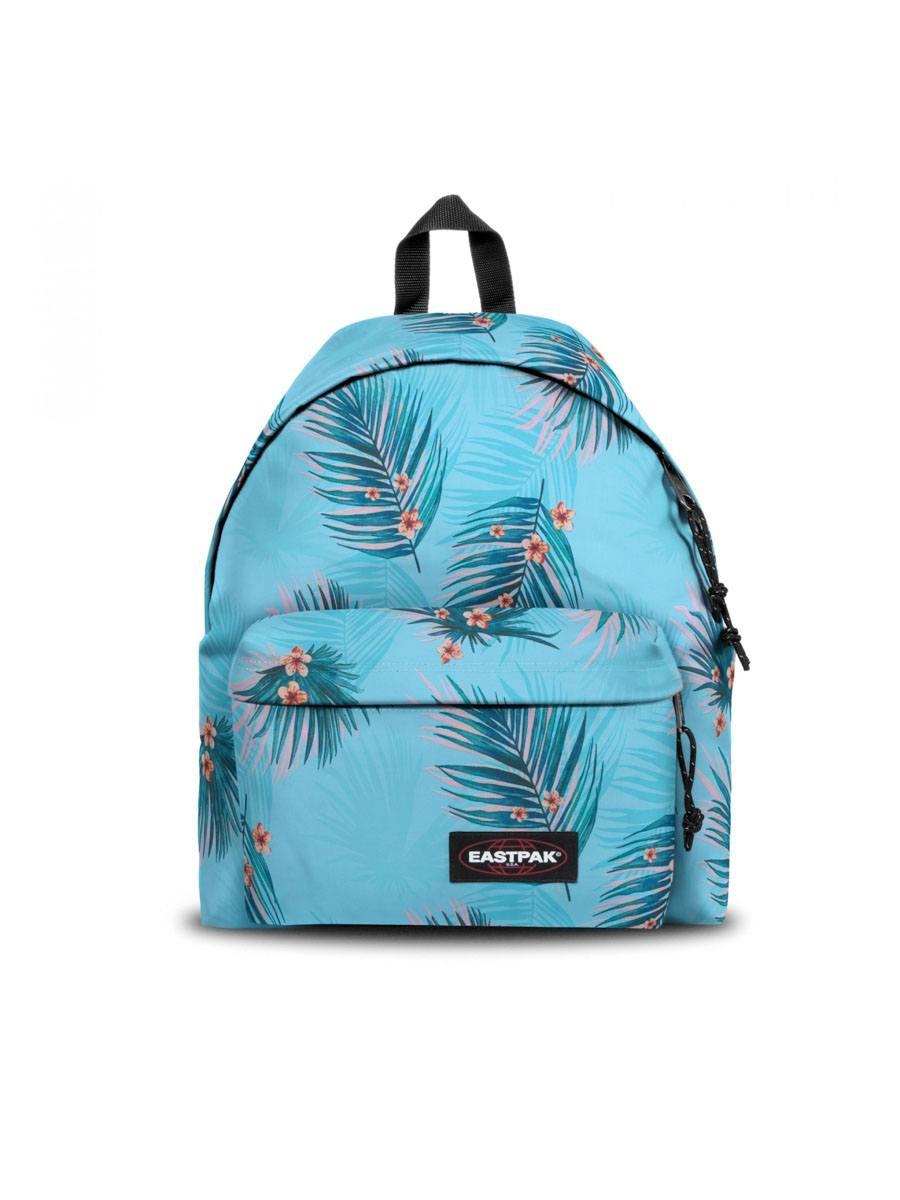 Mochila EastPak. Modelo Padded Pak'r. Azul com estampa tropical. 40x30x18cm. Painel traseiro acolchoado e alças. Bolso externo. Etiqueta do logotipo no bolso. Alça ajustável. Fecho com zíper.