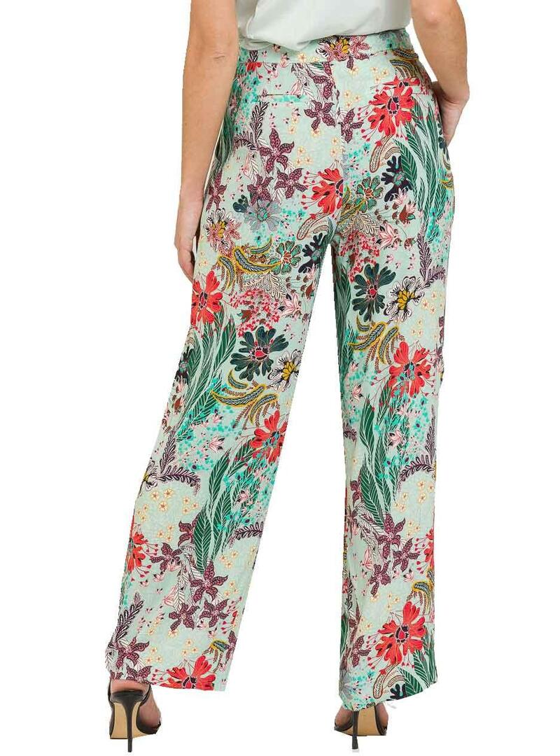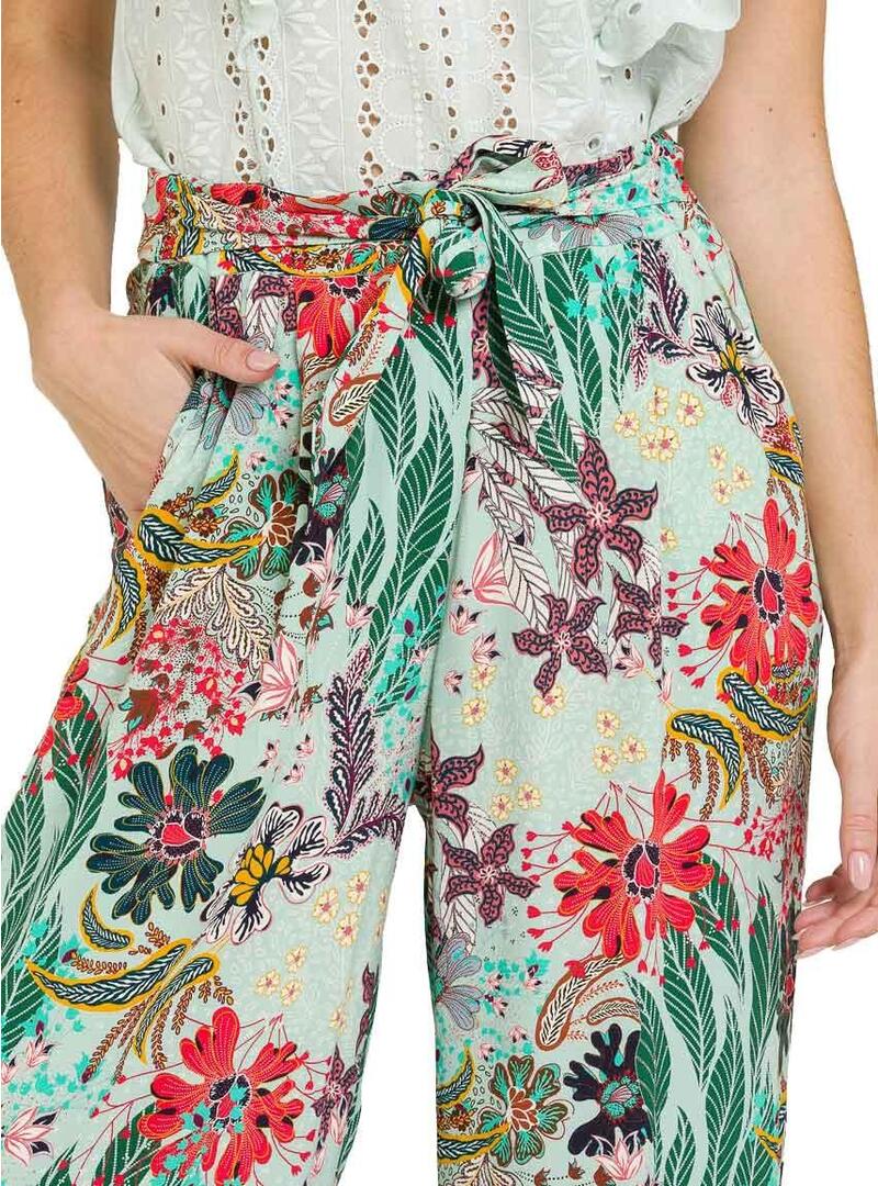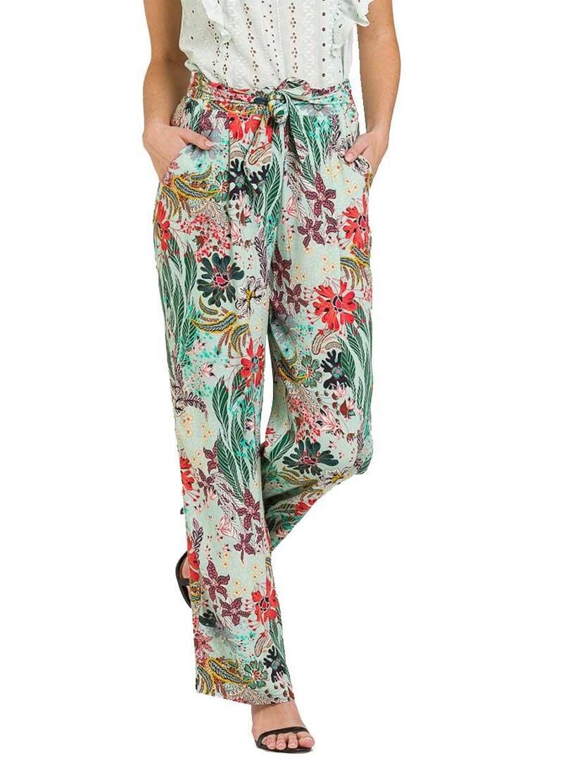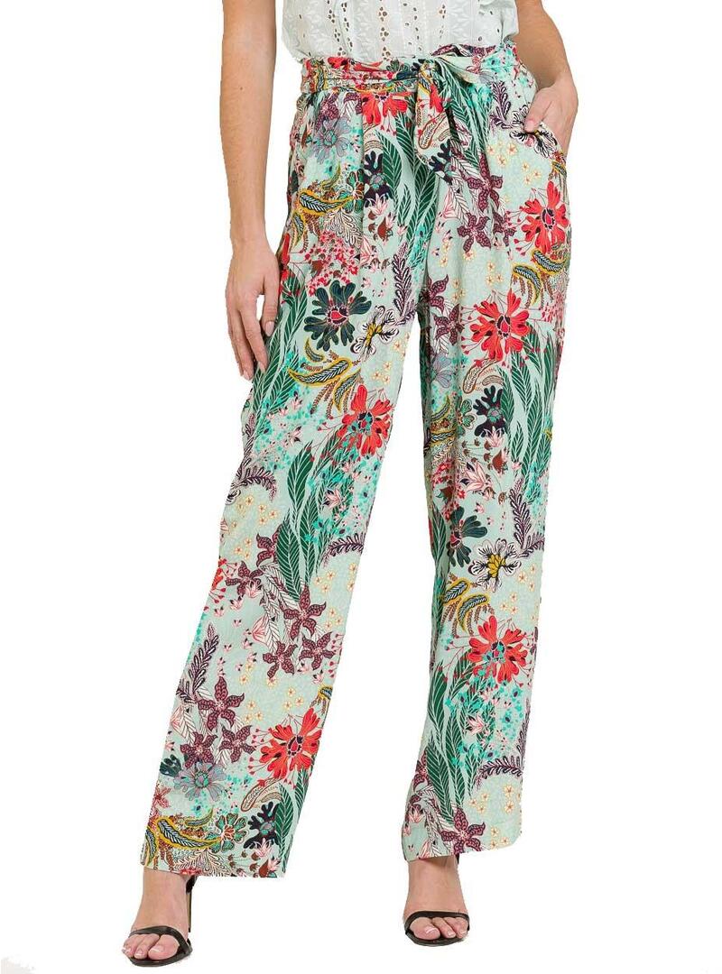 Calças Naf Naf. Modelo Palazzo. Cor verde. Estampa floral. Feche com laço. Cintura elástica. Tecido fluido. Bolsos laterais. A modelo usa tamanho 36.