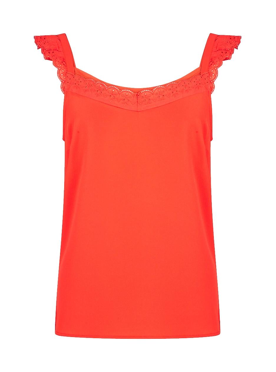 T-Shirt Naf Naf. Cor vermelha. Manga e decote com bordado. Com suspensórios. Decote quadrado. A modelo usa tamanho S.
