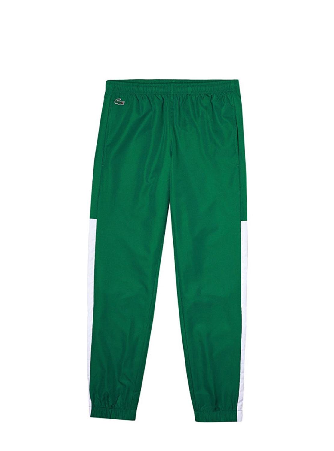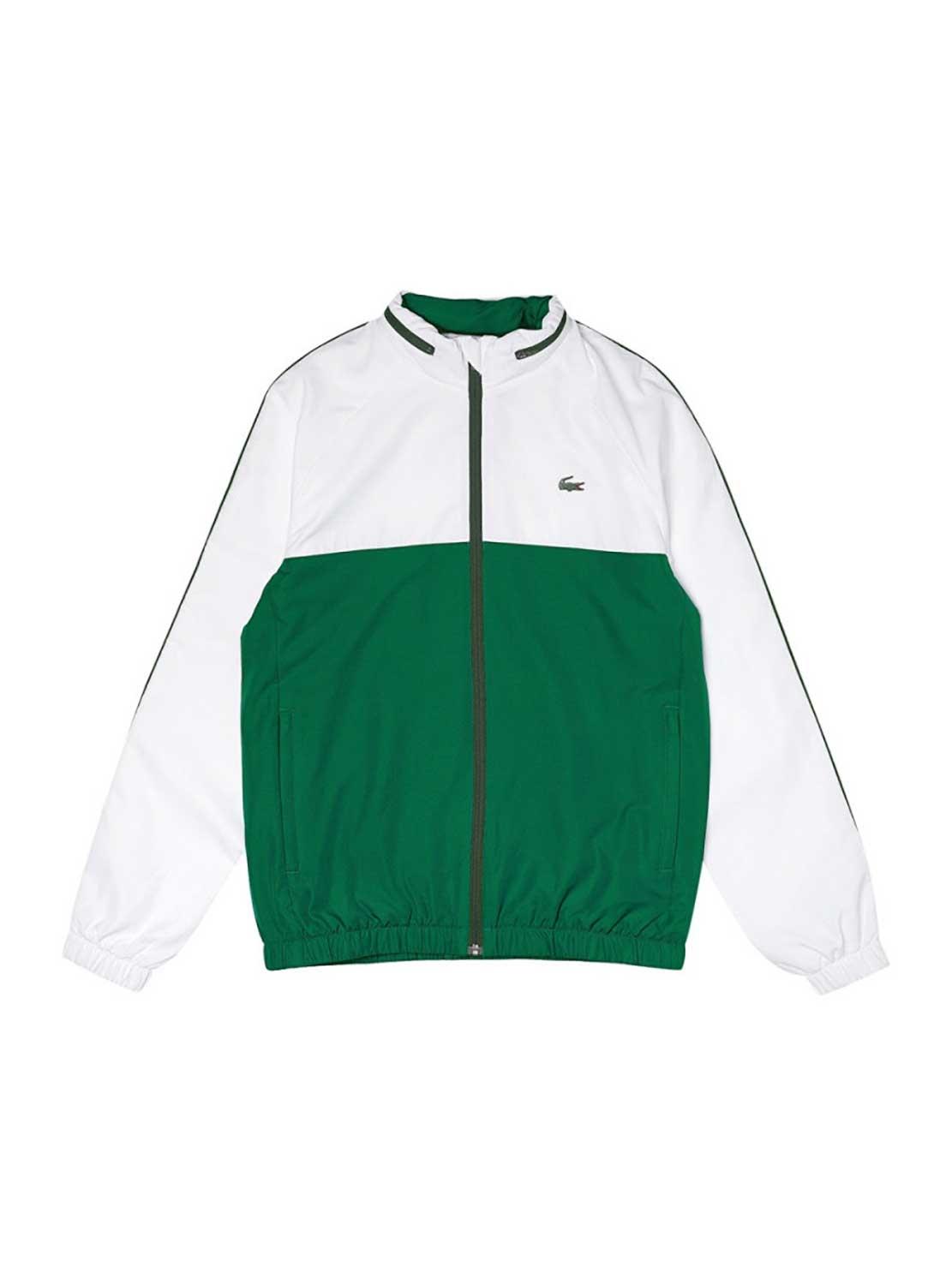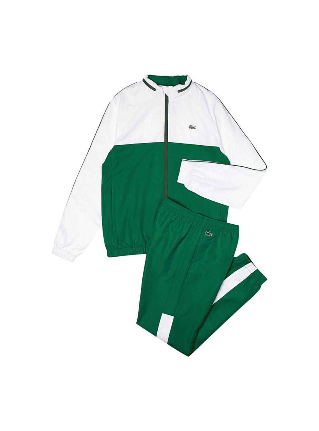 Treino Lacoste Sport. Bloco de cores verde e branco. Fecho com zíper. Casaca com pontas elásticas. Gola alta com capuz. Bolsos laterais. Calças com cordões ajustáveis. Elástico termina. Logotipo selado a quente.