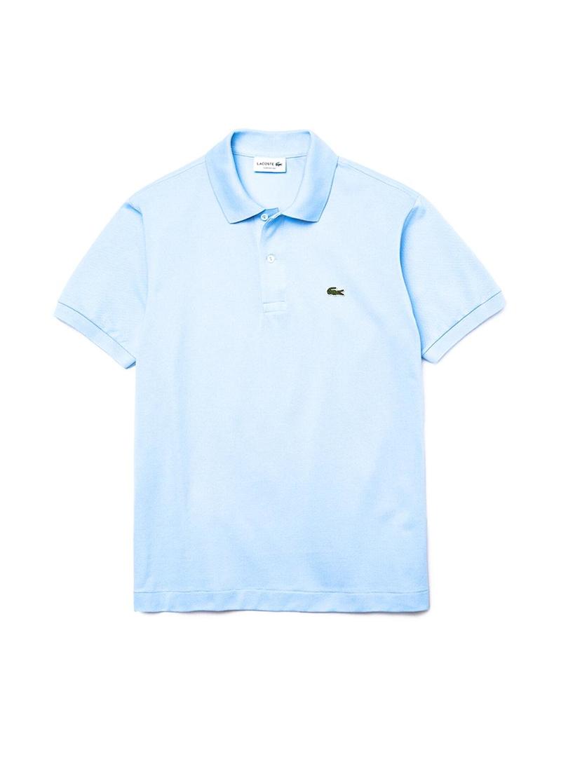 Polo Lacoste. Modelo L1212. Azul claro. Mangas curtas elásticas. Fecho de dois botões. Gola polo. Bordado de crocodilo no peito. A modelo está usando tamanho 4.