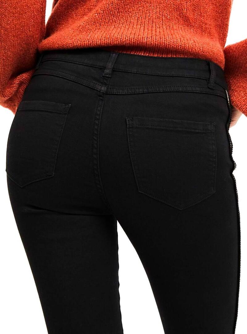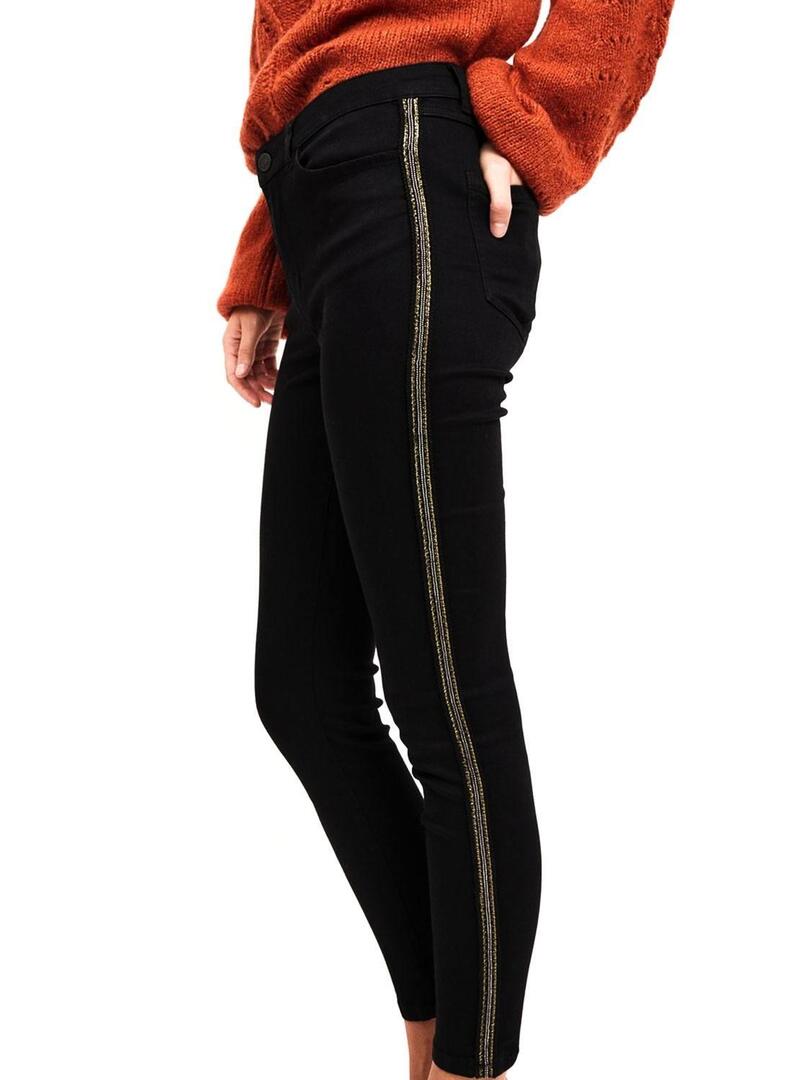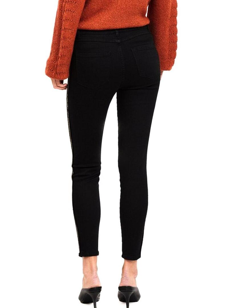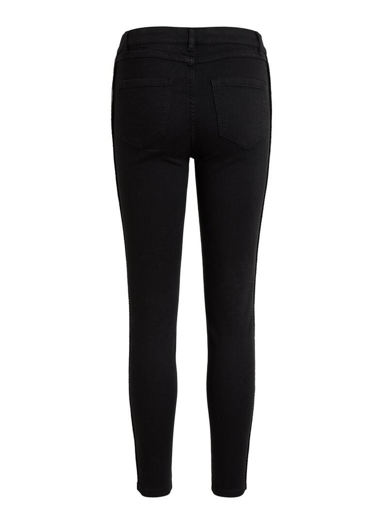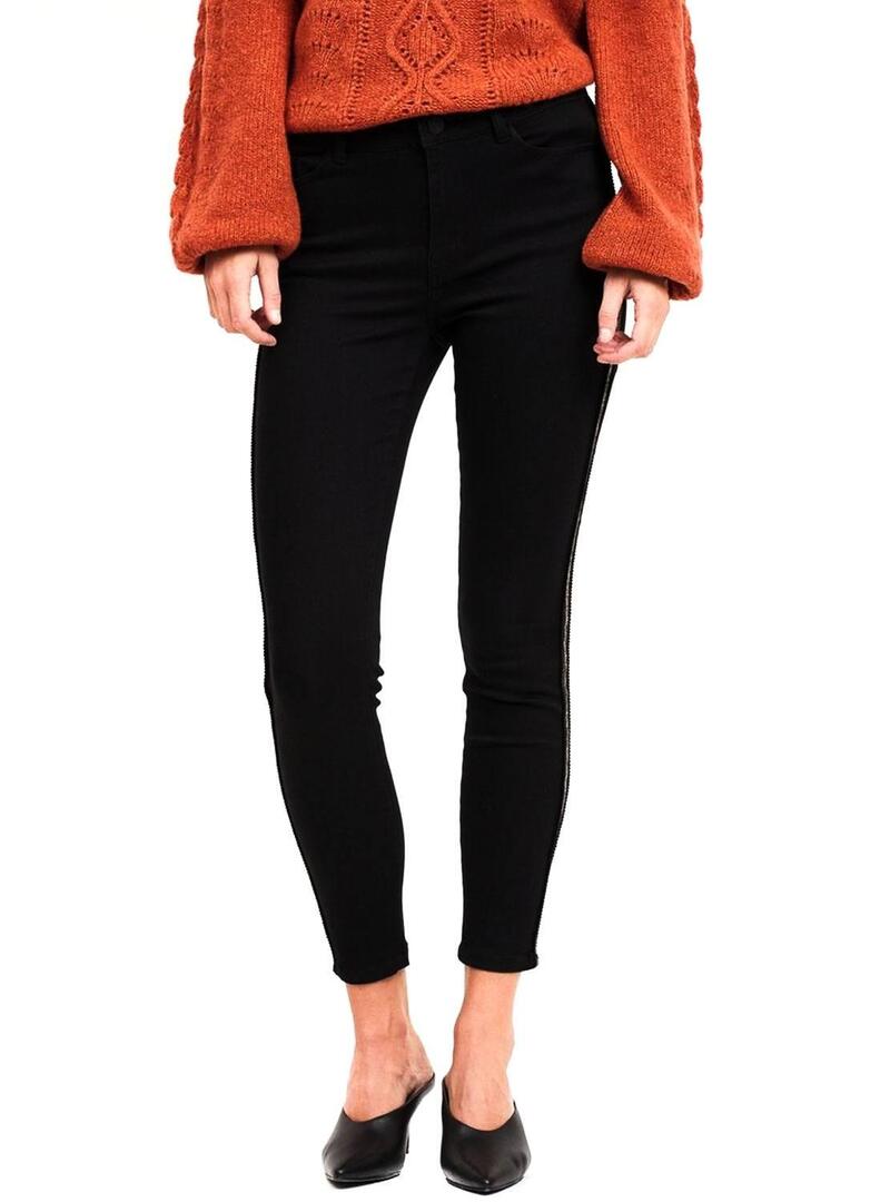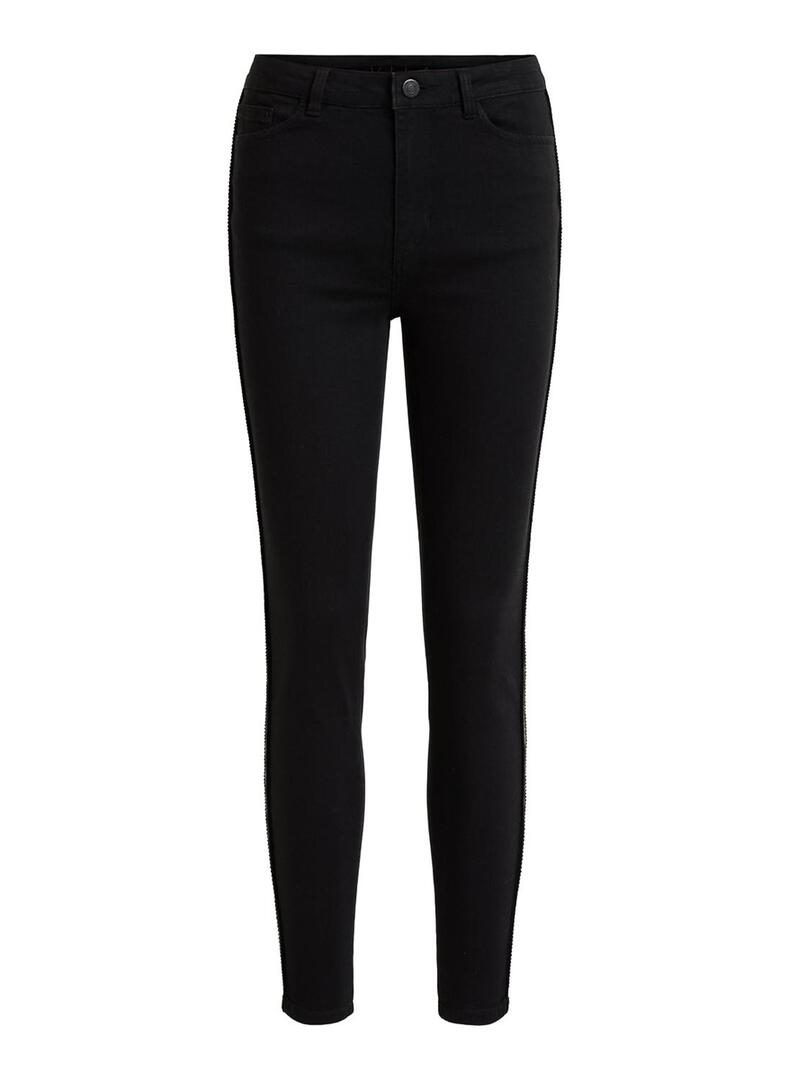 Calças Vila. Modelo Vijunas Track. Cor preta. 5 bolsos. Fechar com botão e zíper. Comprimento 7/8. Linhas de tecido brilhante nas laterais. Ajuste Skinny.