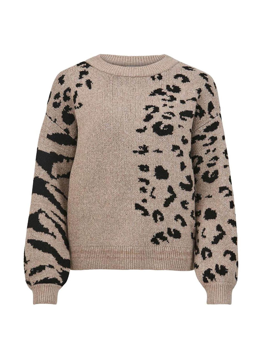Camisola Vila. Modelo Alia. Cor bege. Estampa de animal. Extremidades com nervuras. Ombro caído. Ajuste solto.