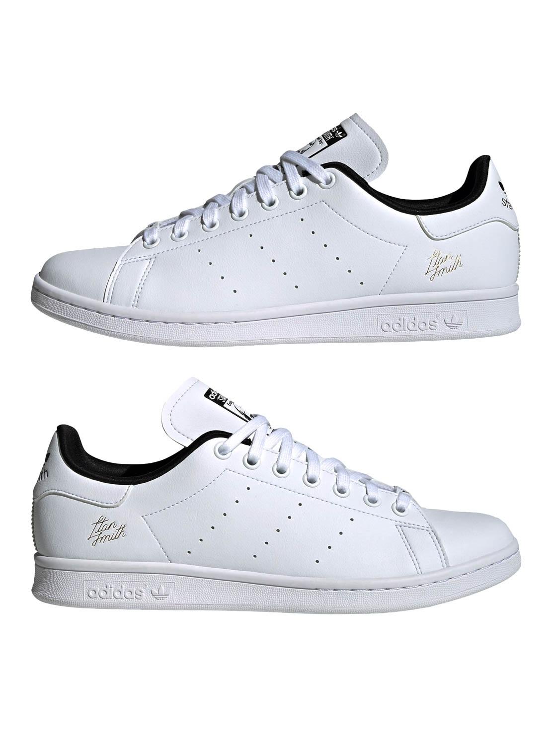 Sapatilhas Adidas. Modelo Stan Smith. Cor branca. 3 faixas perfuradas nas laterais. Retrato e assinatura na língua. Detalhes em preto e dourado.