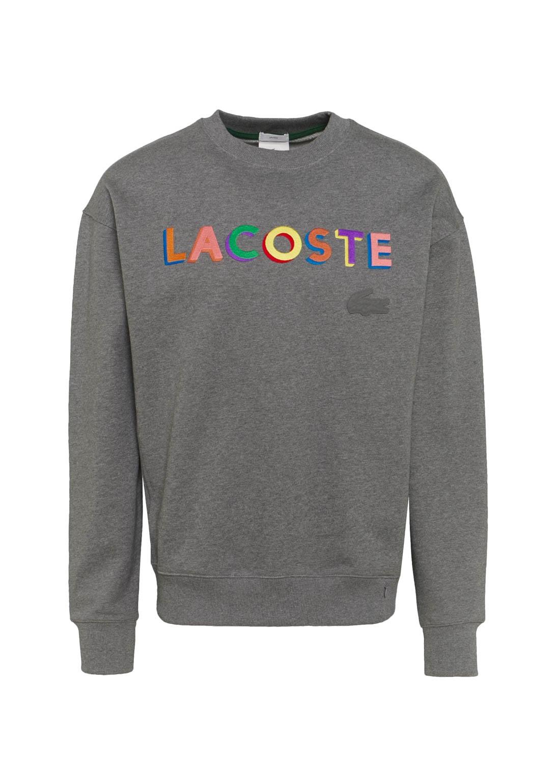 Sweat Lacoste Live. Cor cinzenta. Unissex. Pescoço redondo. Punhos e bainha com elástico borracha. Logótipo lacoste multicolorido no peito.