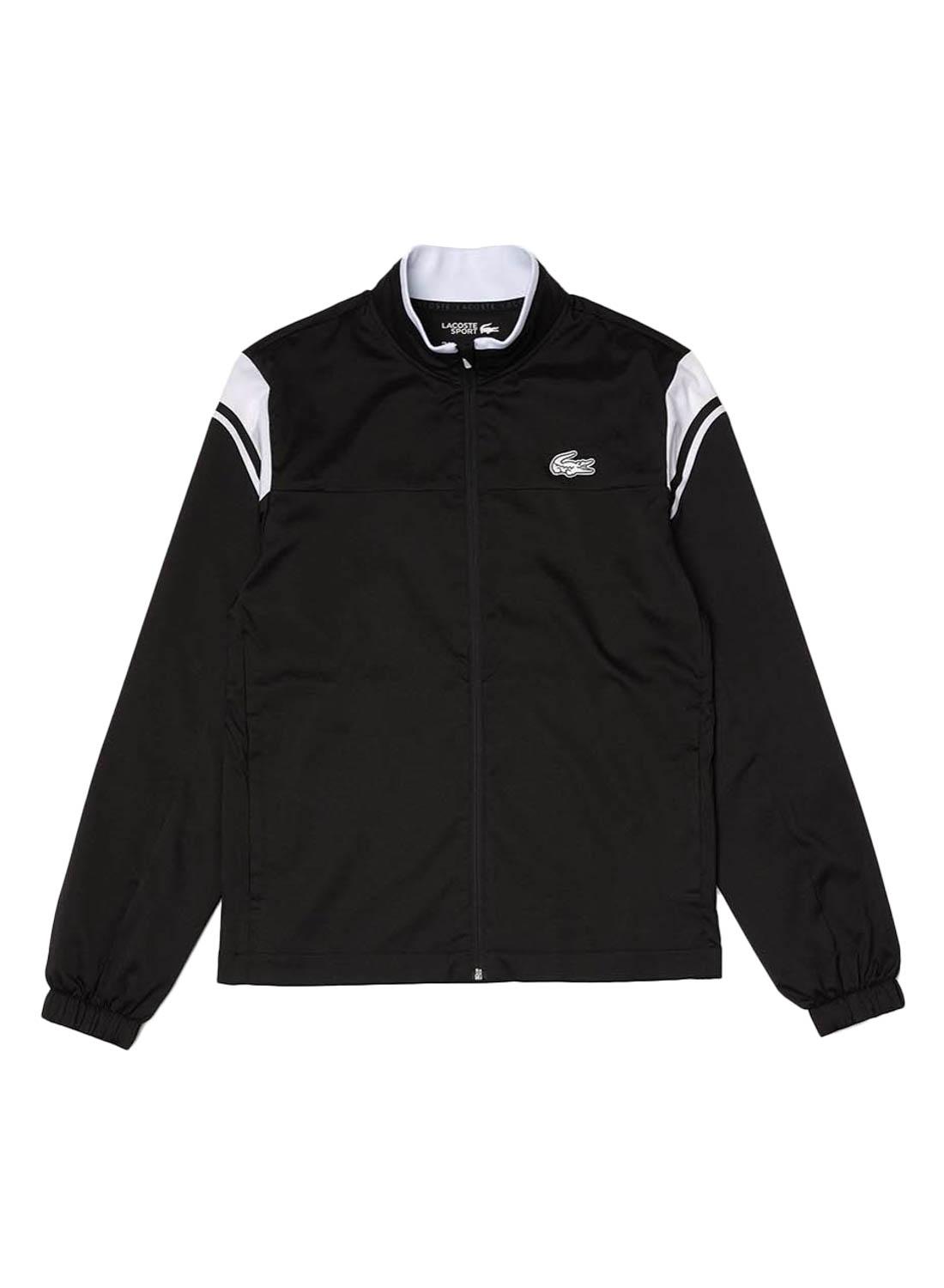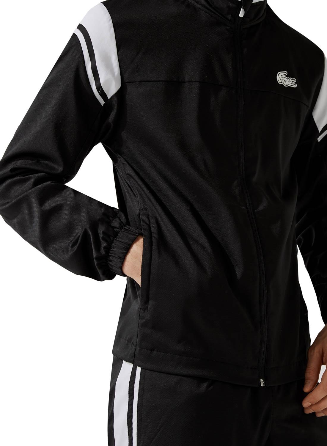 Fato de treino Lacoste. Cor preta. Detalhes em branco. Casaca gola alta. Fecho com zíper. Bolsos laterais. Elástico Borracha nos punhos e na bainha. Pantalon com cintura elástica ajustável. Logotipos selicone bordados. Tornozelos elásticos.