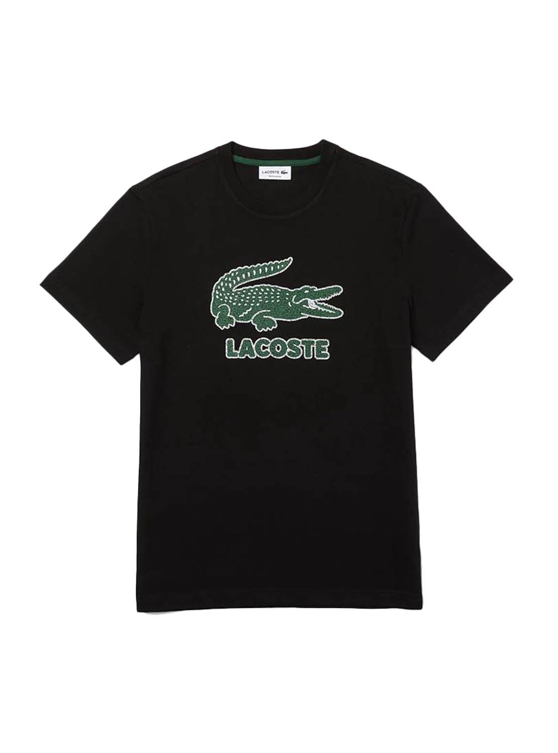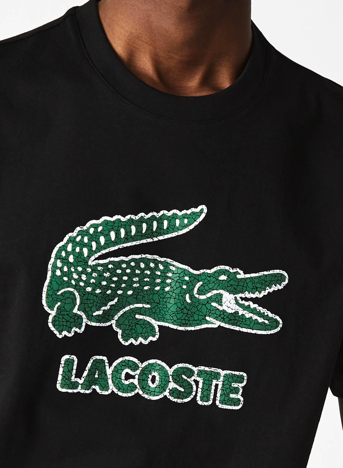 T-Shirt Lacoste. Model TH0063. Cor preta. Gola redonda nervurada. Manga curta. Crackle crocodile no peito. Logótipo bordado na nuca.