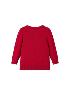 Camisola Name It. Modelo Rakul. Cor vermelha. Desenho de uma rena no peito. Gola redonda larga. Decote, punhos e bainha elásticos. Regular fit. Fabricado com algodão orgânico. Tamanho normal.