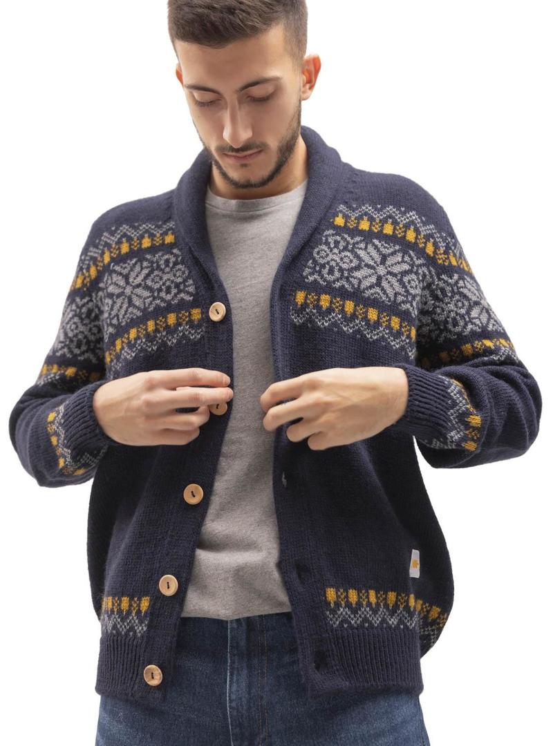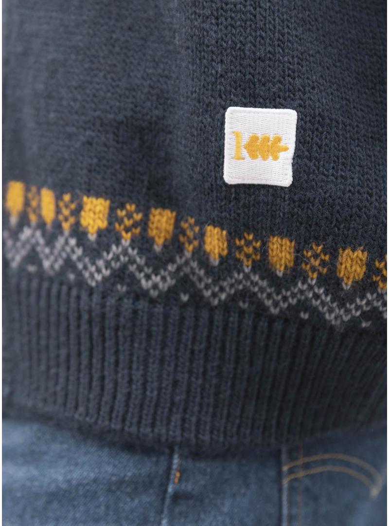 Casaca Klout. Natal Model. Cor azul. Fecho com botão de madeira. Emblema do logotipo bordado no parte frontal. Impressão geométrica de contraste.