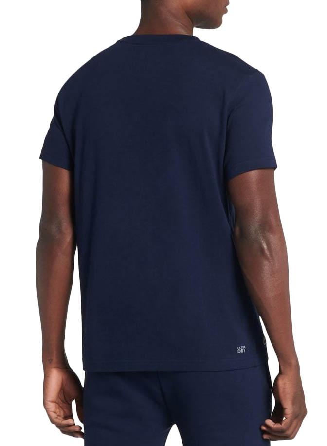 T-Shirt Lacoste Sport. Manga curta. Pescoço redondo. Impressão do logotipo no peito. Cor marinha. Tecido jersey de algodão técnico e respirável.