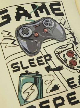 T-Shirt Name It. Modelo Boris. Cor bege. Manga comprida. Pescoço redondo. Estampa com tema de jogos no peito. Leve e elástico. Regular fit