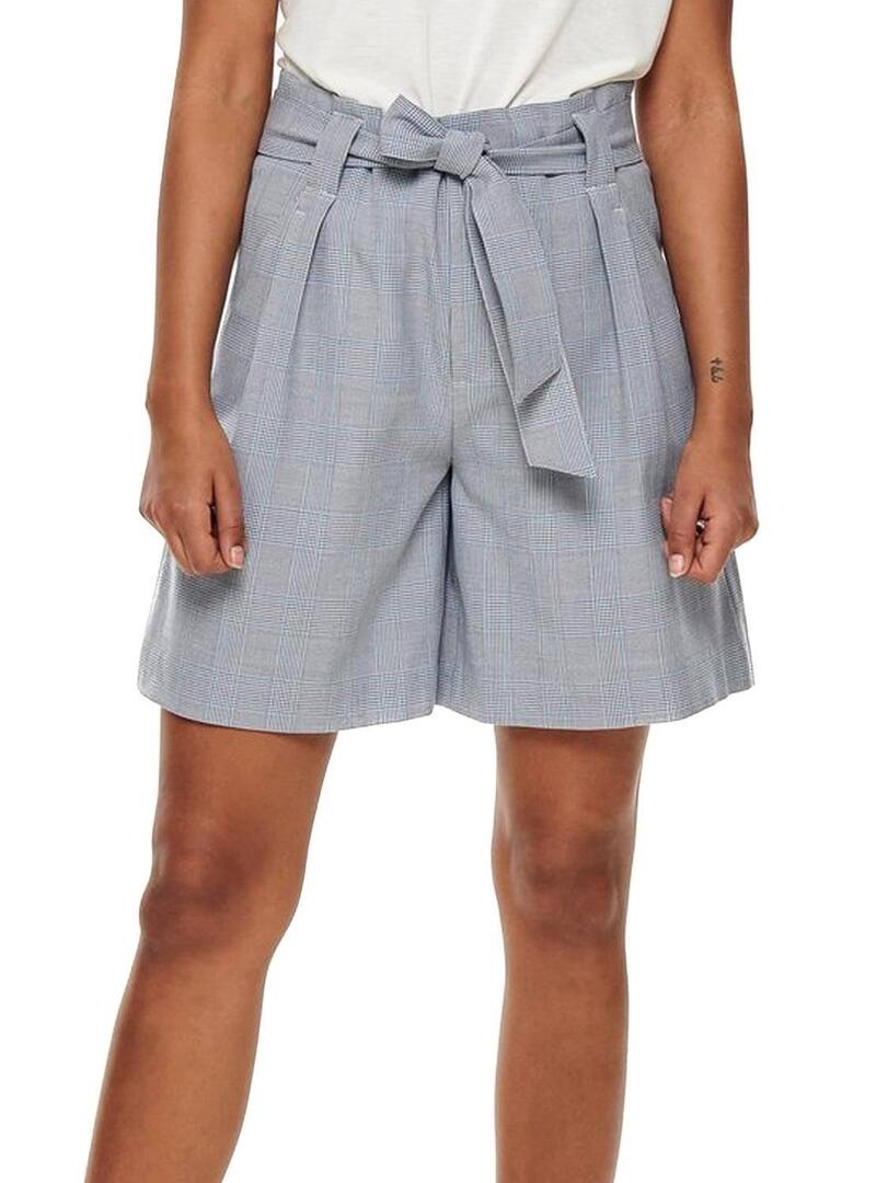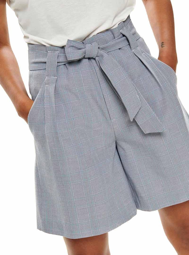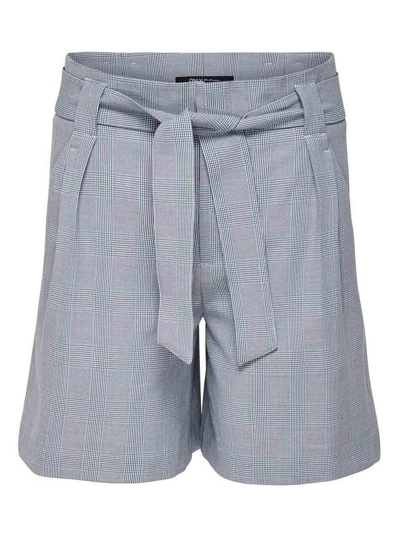 Short Only. Modelo Raya Check na cor cinza. Tecido elastico. 4 clipes. 2 bolsos traseiros de adorno. Fechar com broche. Cinto com nó. O modelo usa tamanho 36.