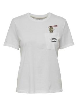 T-Shirt Only. Modelo Polly. Cor branca. Pescoço redondo. Manga curta. Bolso de Cartas Detalhe de pauzinhos com espaguete.