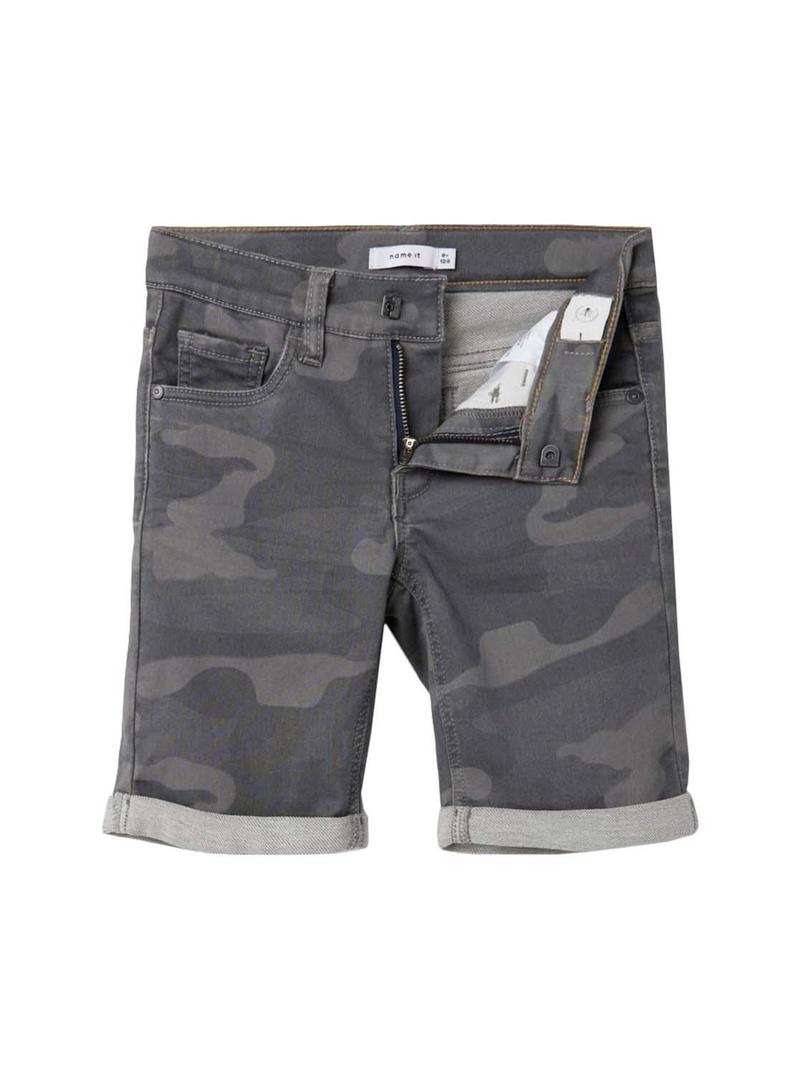 Bermuda Denim Name It. Modelo Theo Tayson. Estampa de camuflagem cinza. Cinco bolsos. Fechamento por botão e zíper. Estique o tecido jeans.